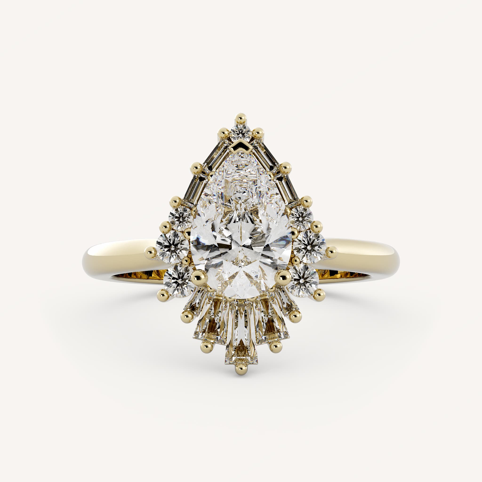 Victoria features a pear center stone accented with an elaborate halo with round, straight and tapered baguettes in a basket setting on a half round shank.