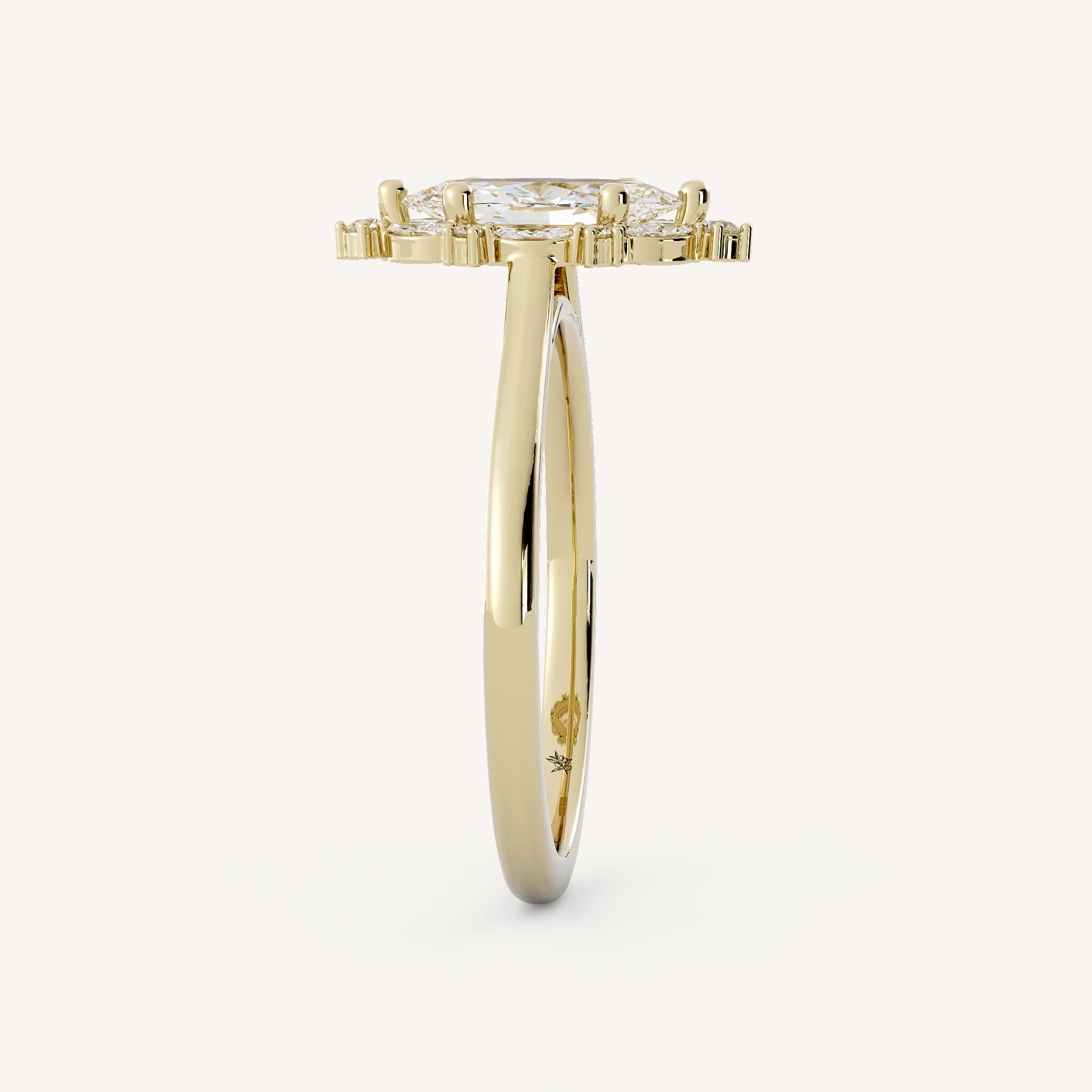 Vida features a marquise center stone with an intricate halo of round and marquise stones in a cathedral setting on a half round shank.