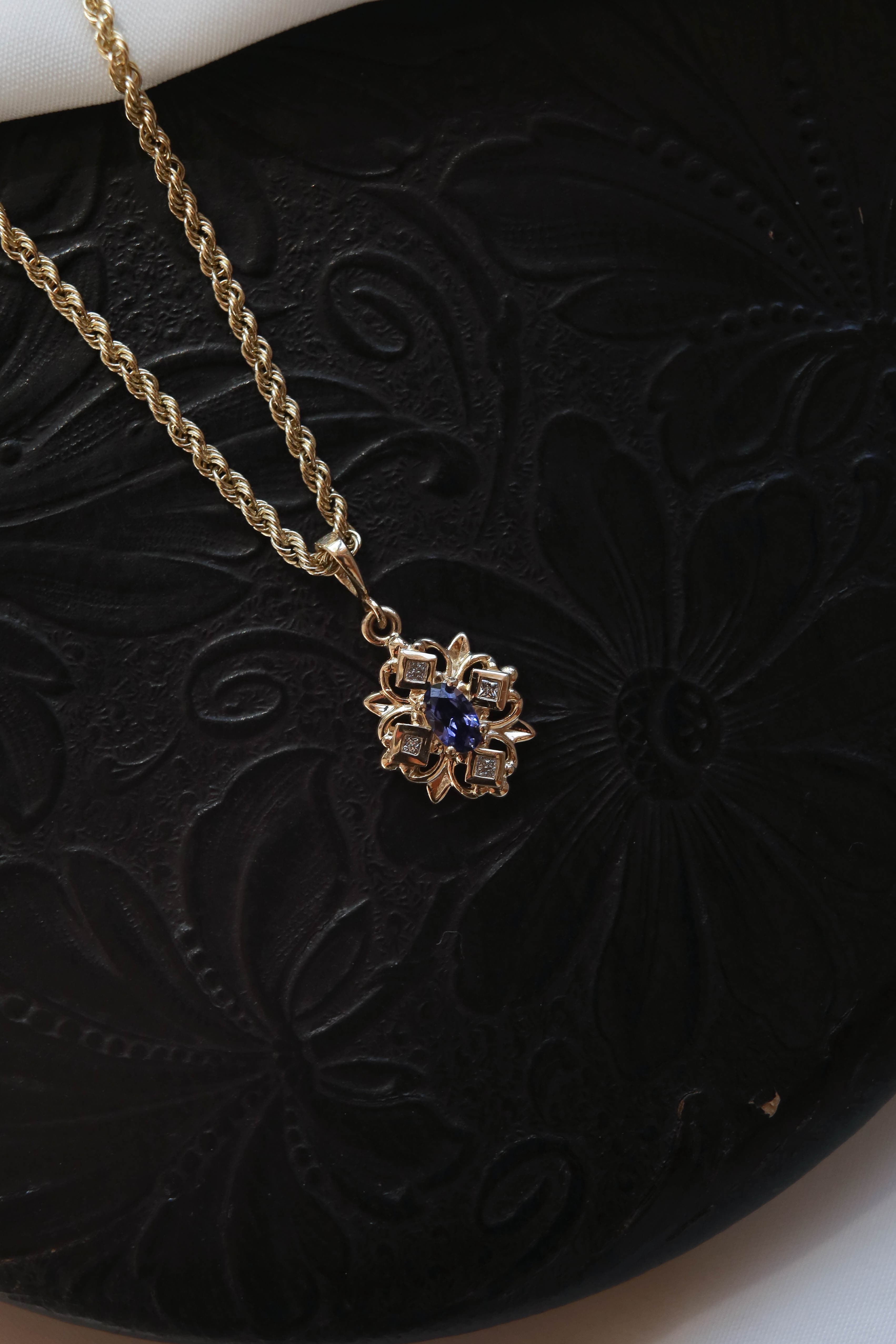 Adding an elaborate and luxurious touch, The Vintage Gemstone & Diamond Charm showcases a beautiful oval cut lab grown blue sapphire highlighted by four princess cut lab diamonds surrounded in 14K gold.