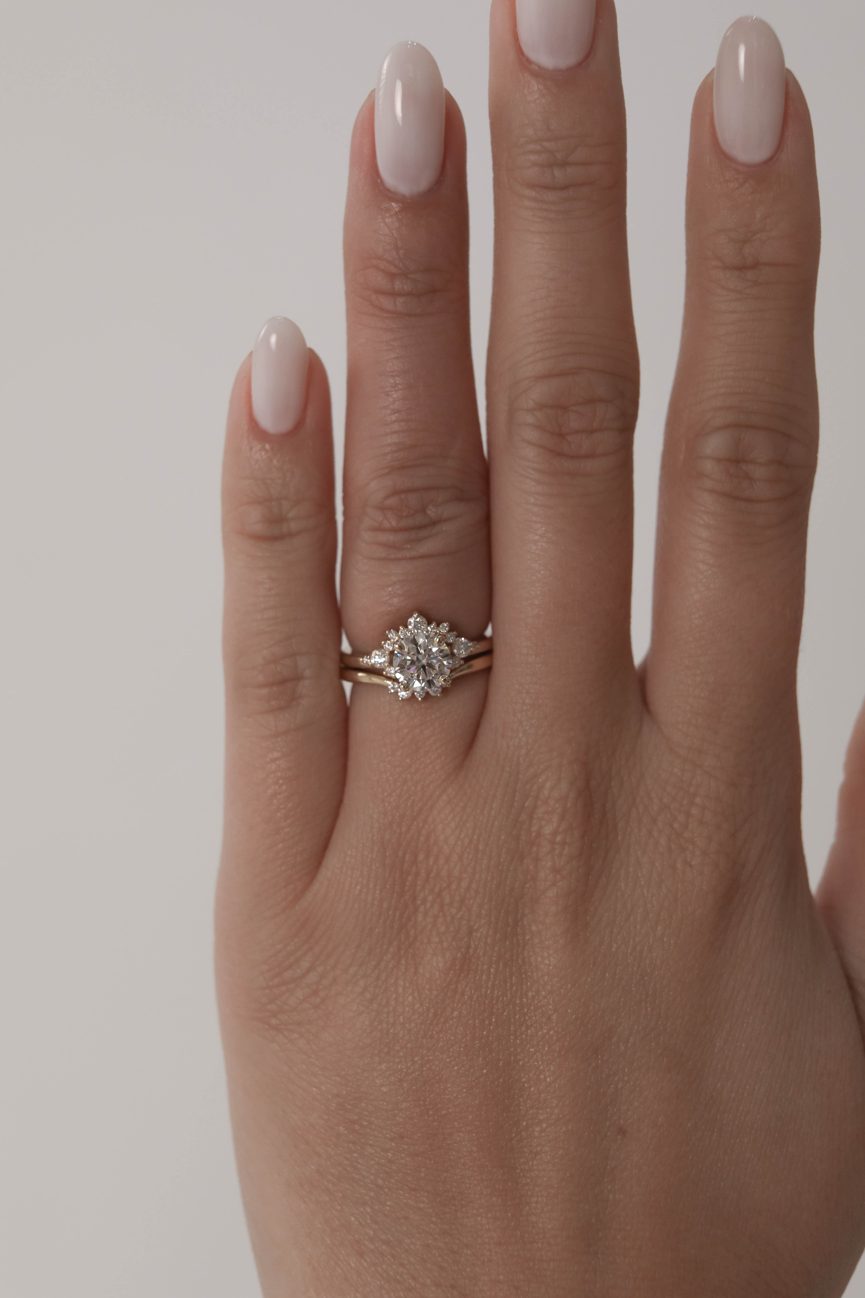 Virgo features a round center stone with an asymmetrical halo comprised of various sized round stones on a half round shank. Paired with the Virgo Band which features five round stones set in a contour shank to complement the Virgo ring.