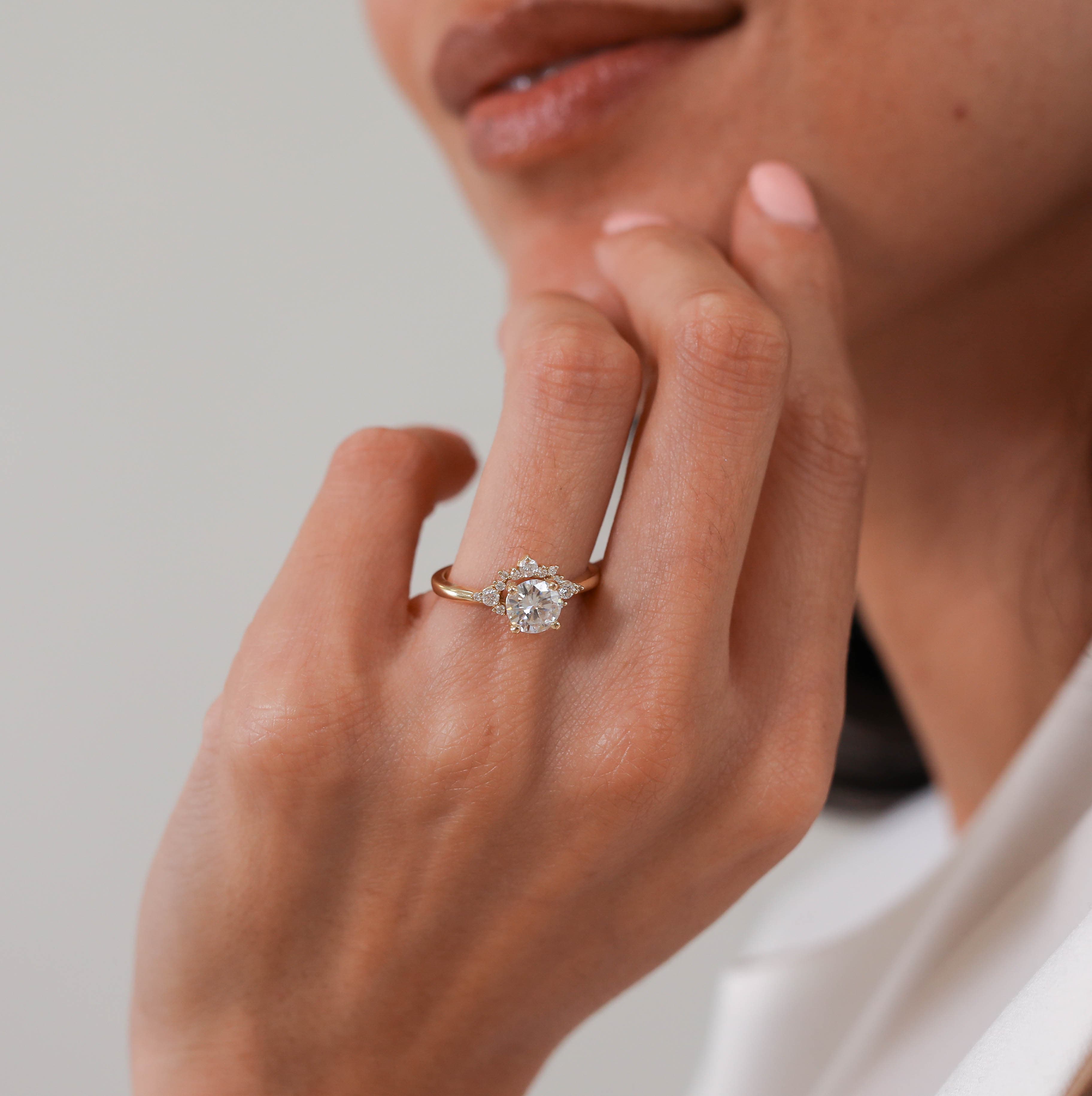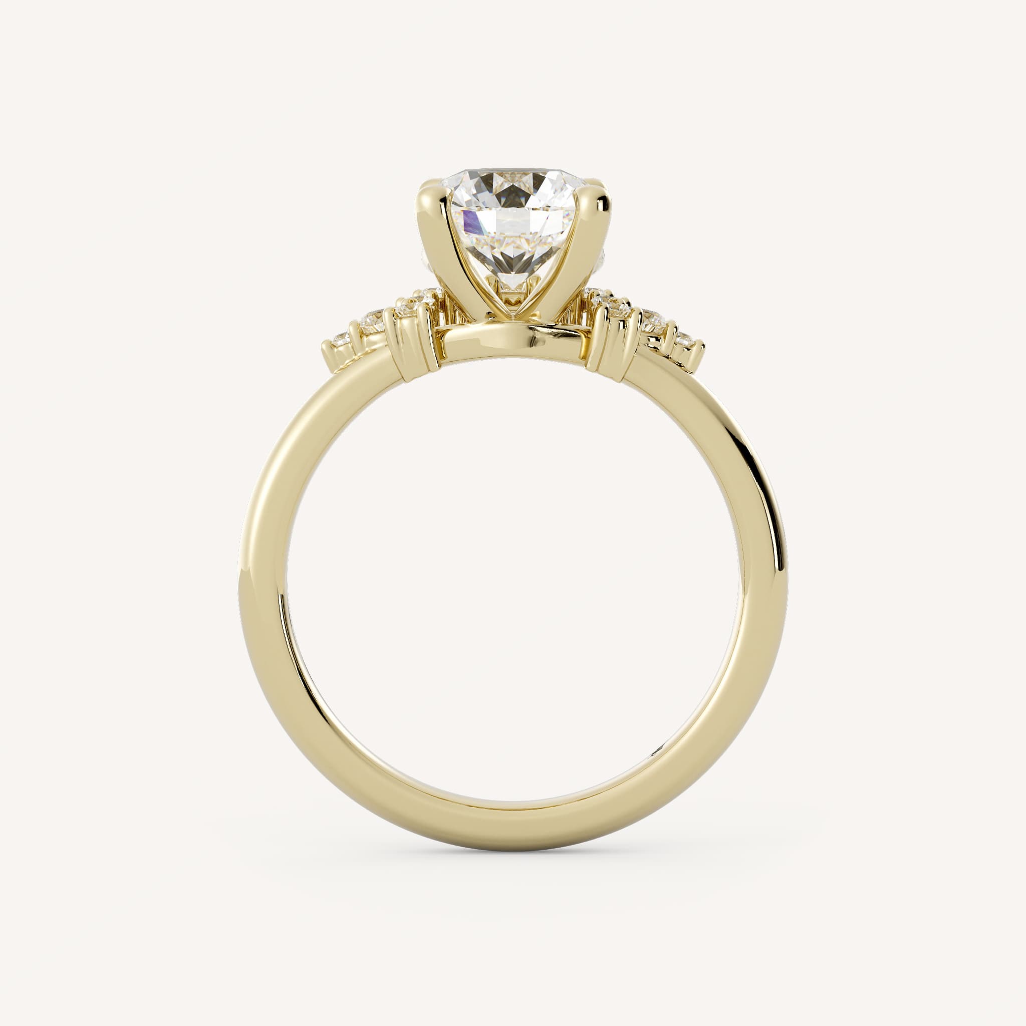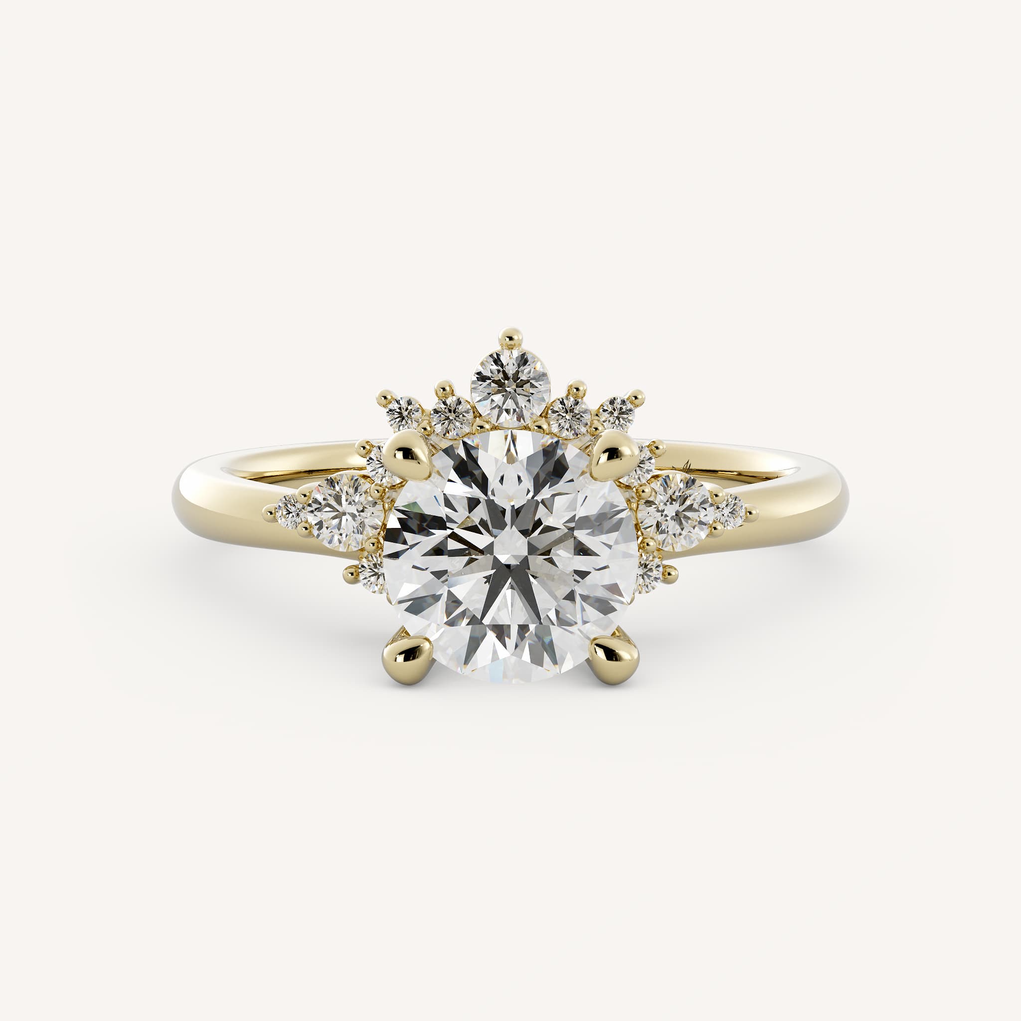 Virgo features a round center stone with an asymmetrical halo comprised of various sized round stones on a half round shank.