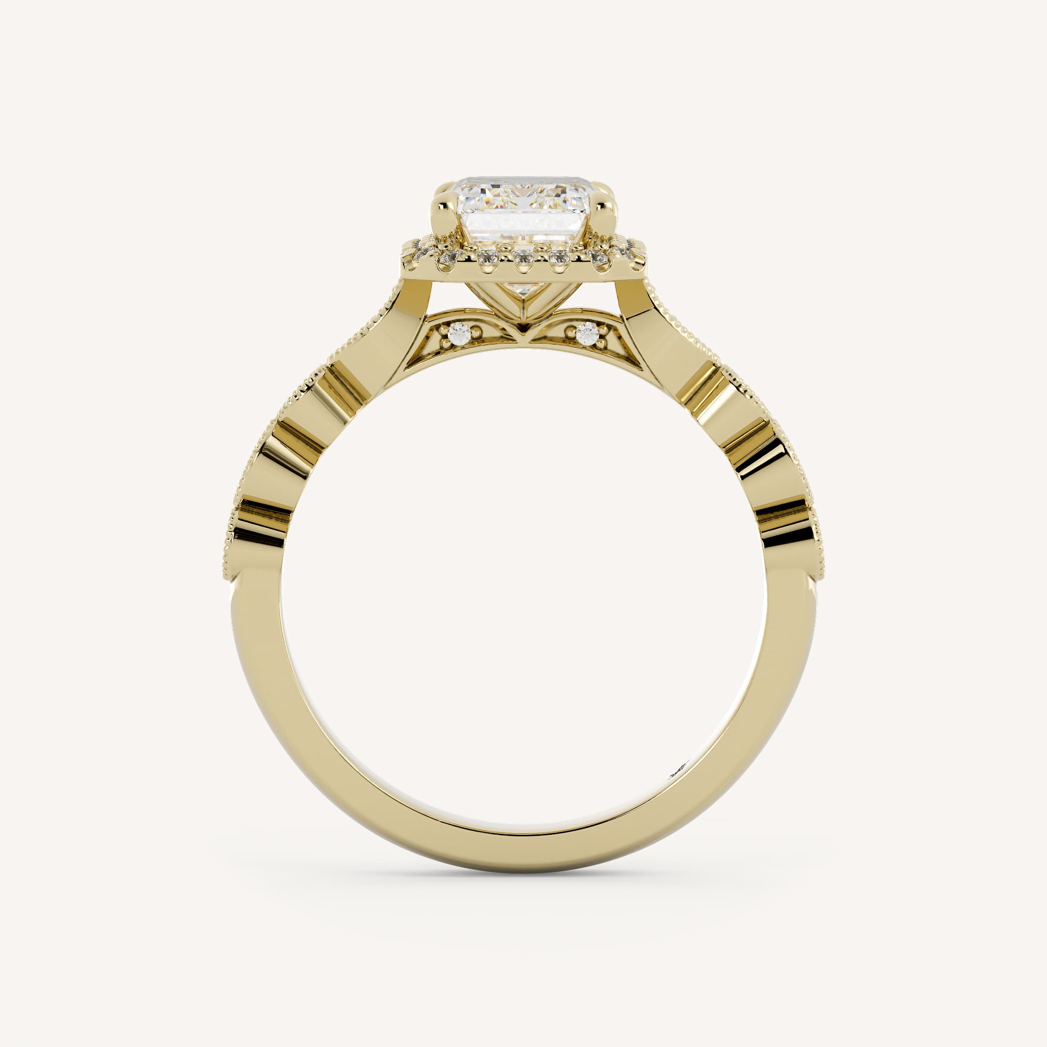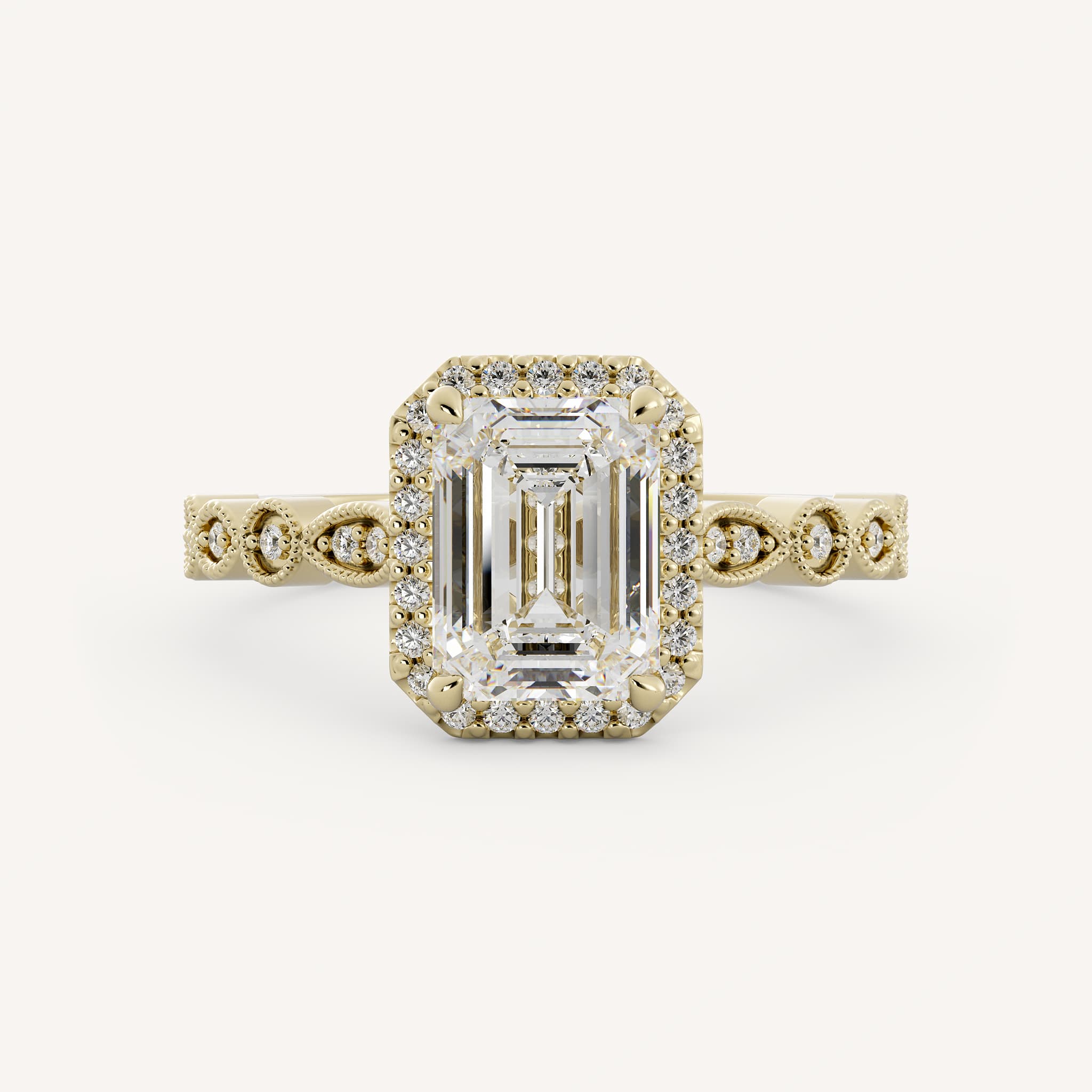 Camille features an emerald shaped center stone with a classic halo and a cathedral setting and hidden diamond accents. Set on a bezel shank with accent stones and milgrain detail.
