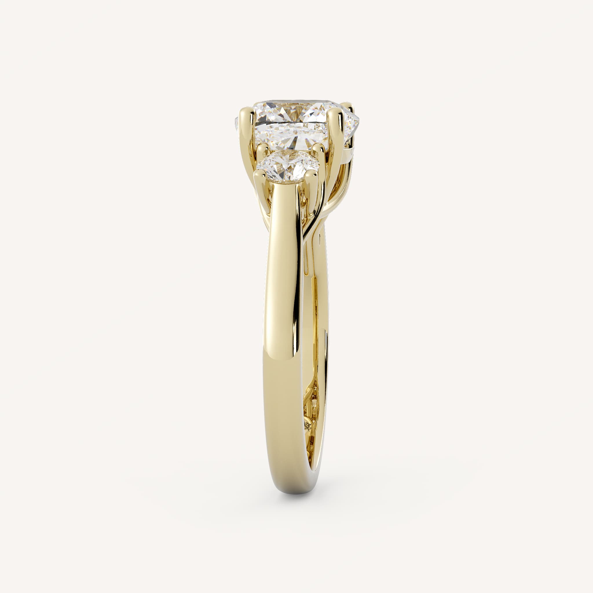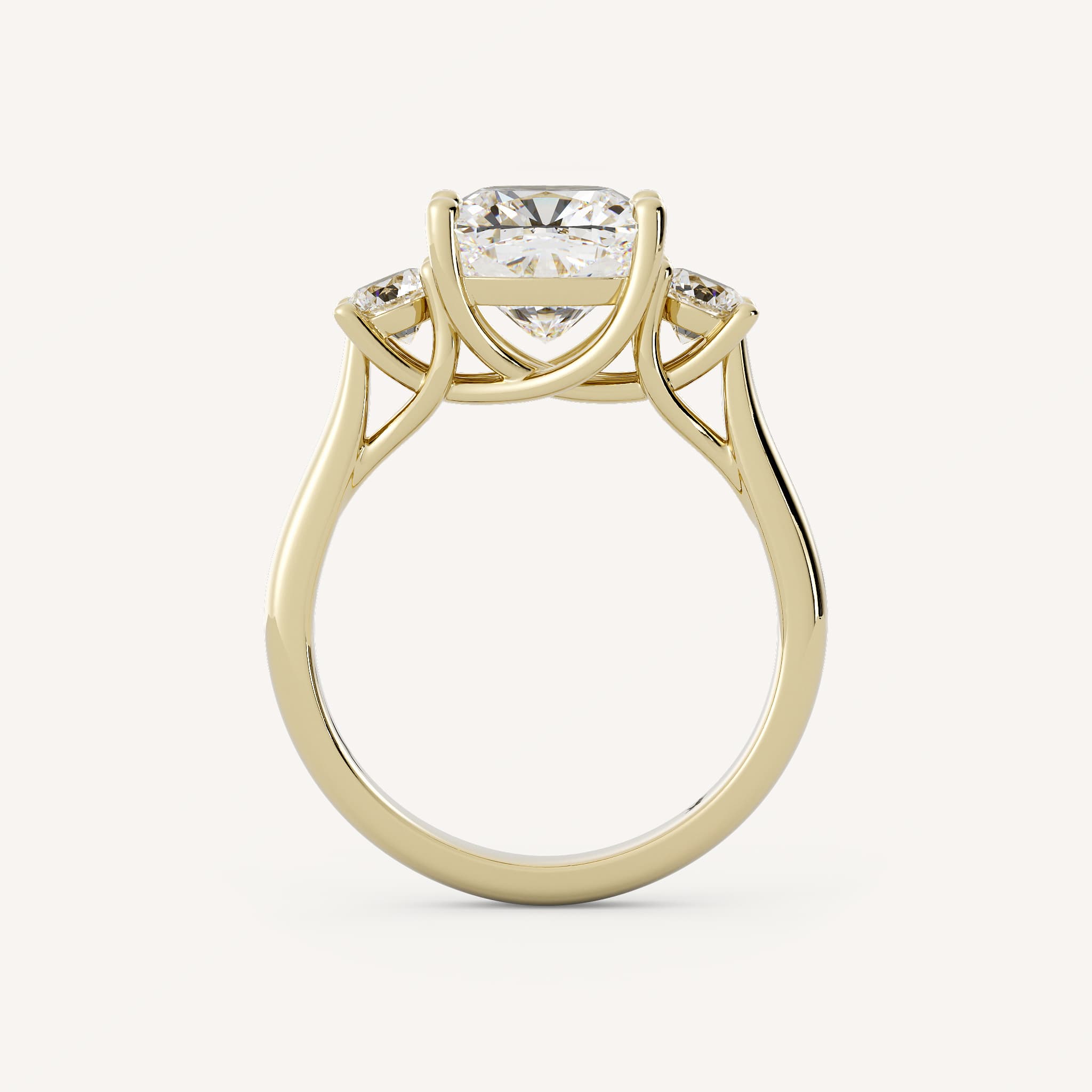 Duchess features a graceful cushion center stone set in an elegant trellis setting accented by two round side stones on a half round shank.