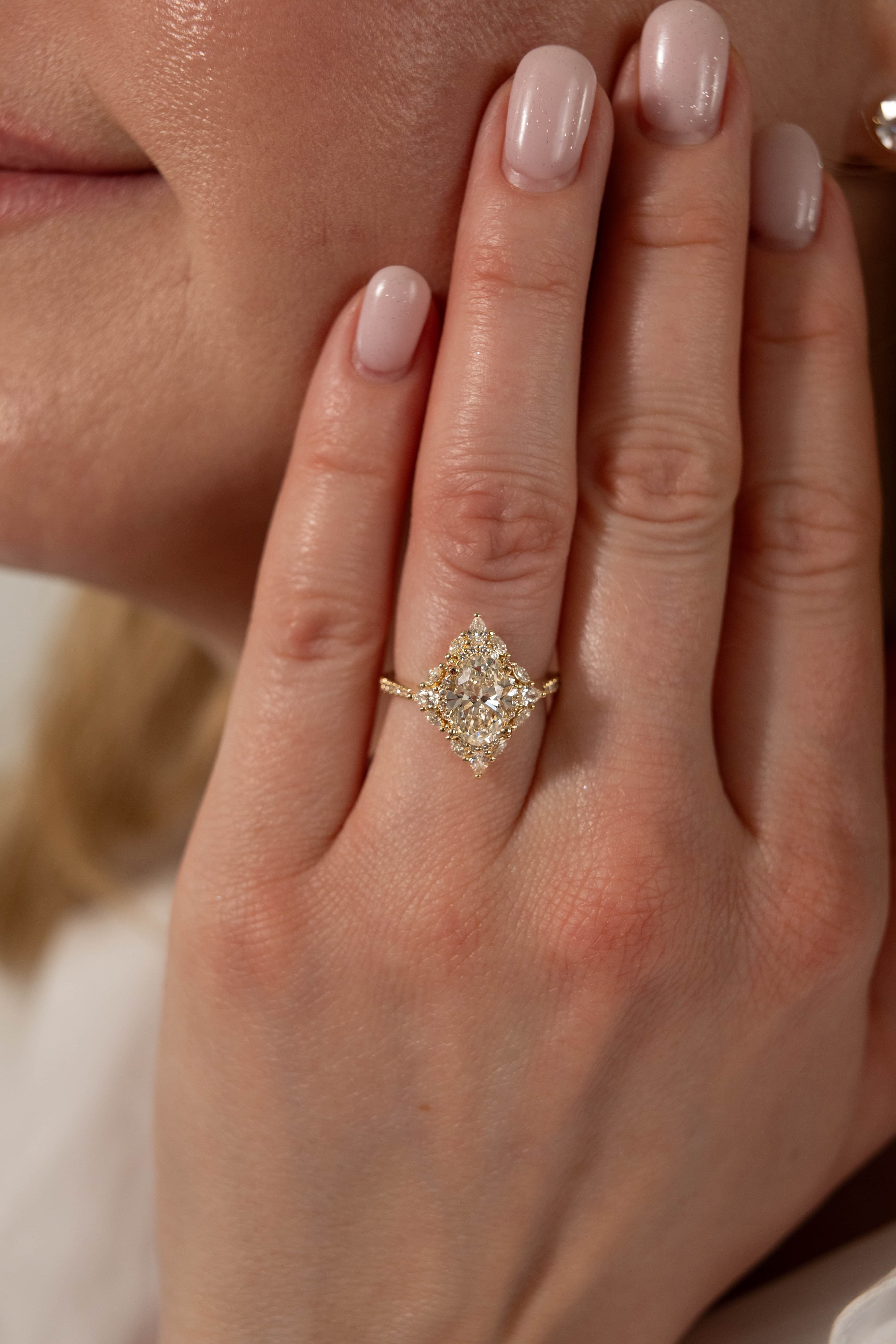 Layered brilliance with a timeless point of view. The Frances Ring features an oval center stone framed by a classic inner halo, followed by a striking outer halo of marquise and pear-shaped stones that create depth, movement, and dimension. Set in a sculptural basket setting and finished with a traditional prong diamond shank, every detail is designed to enhance its radiant presence.