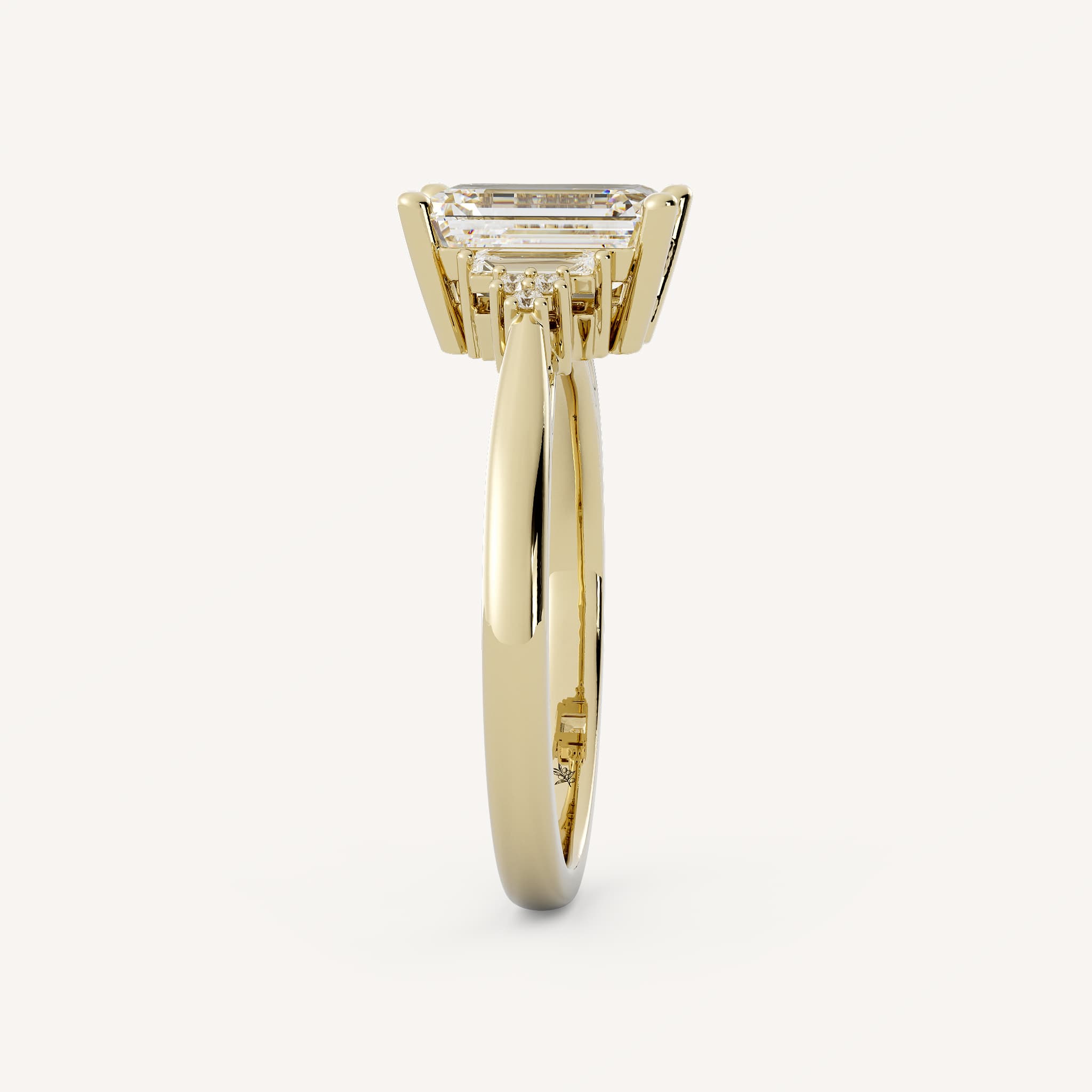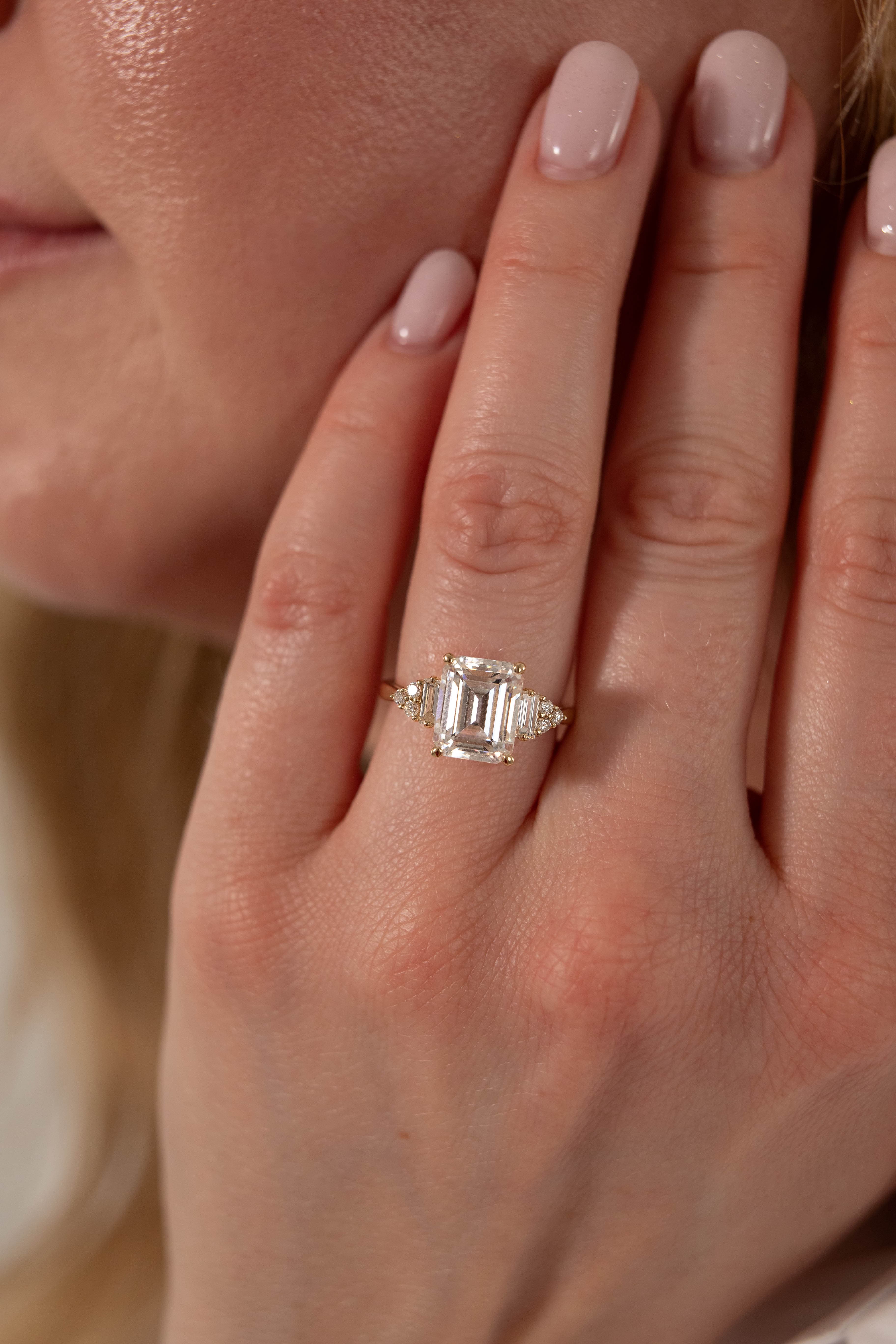 Graceful lines meet thoughtful detail. The Hope Ring features an emerald-shaped center stone complemented by side clusters of baguette and round stones, creating a balanced interplay of structure and sparkle. Set in a sculptural basket setting and finished with a half round, flat-edge shank, the design feels both refined and enduring.