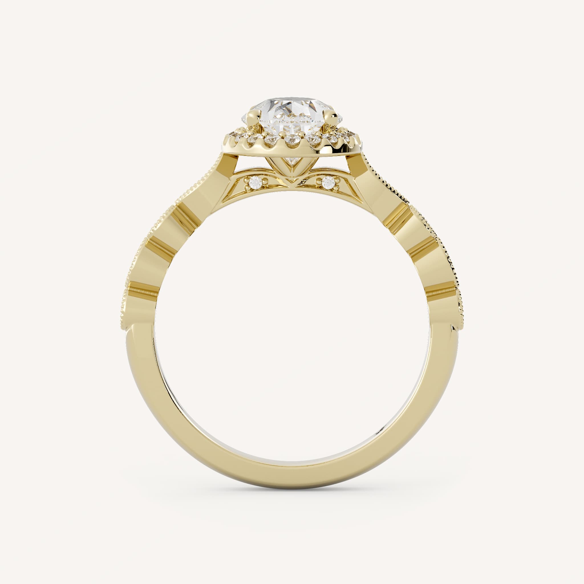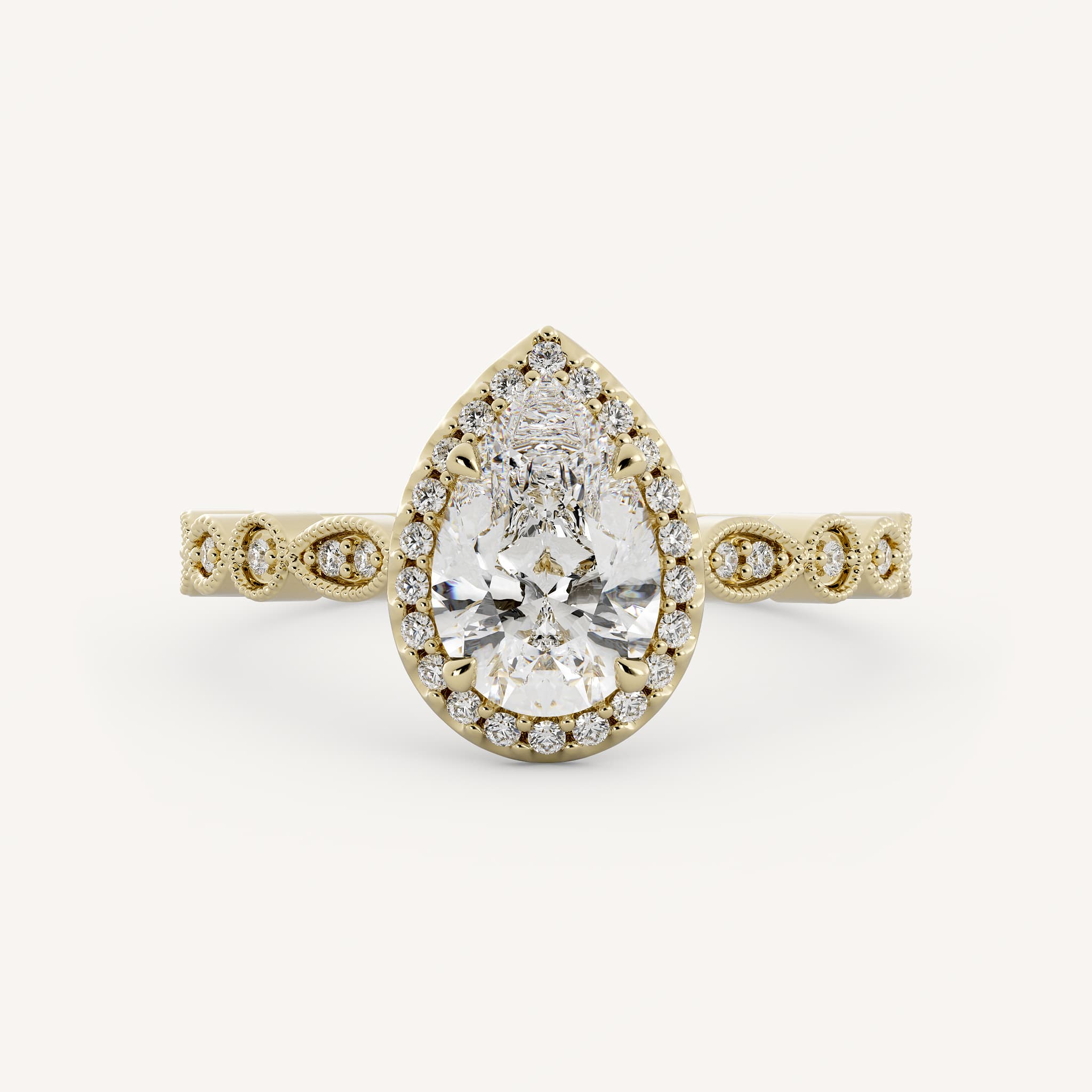 Mallorie features a pear center stone with a classic halo set in cathedral setting with hidden diamond accents. Set on a bezel shank with accent stones and milgrain detail.