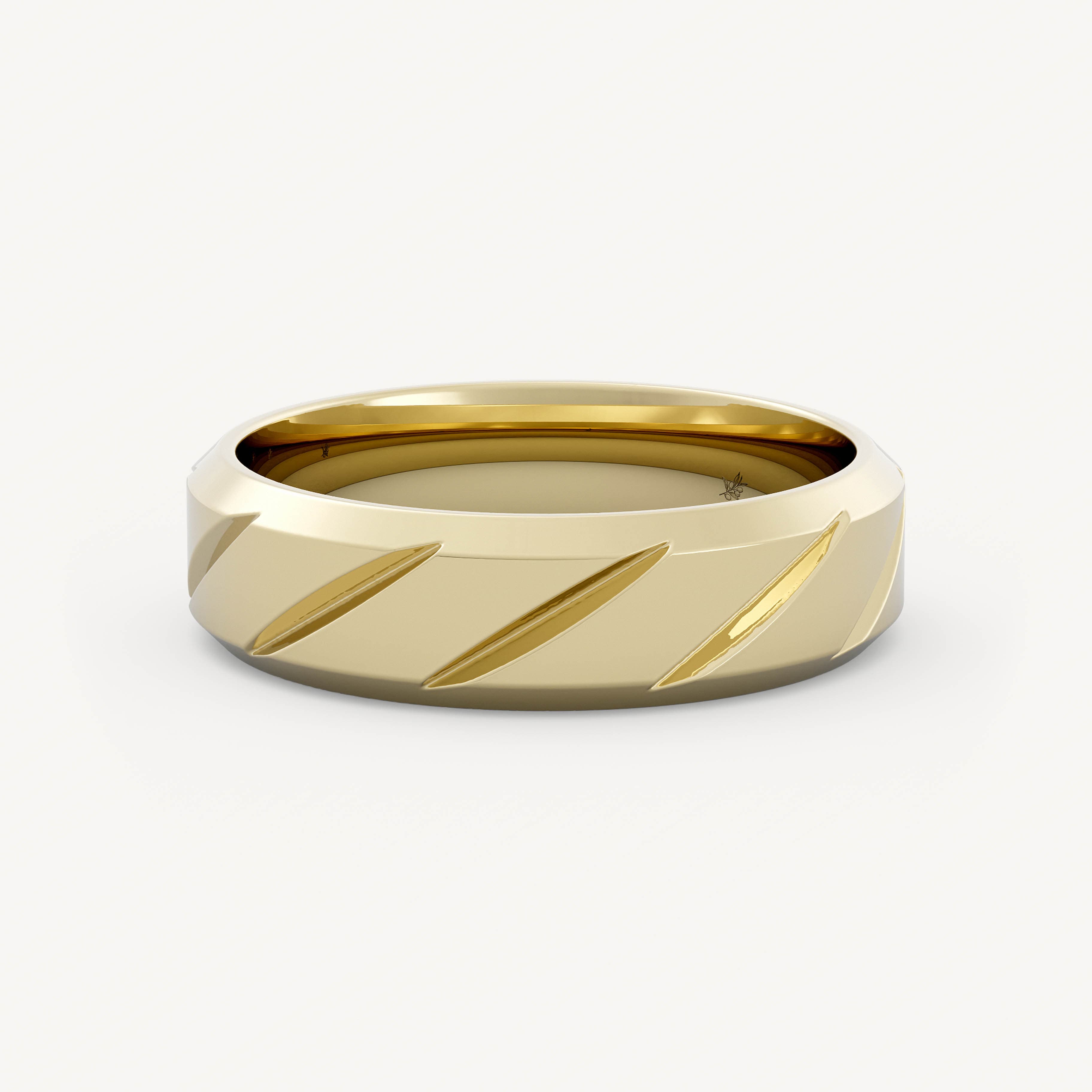 Clyde is an abstract 6mm half round band with diagonal groove detail and a comfort fit.
