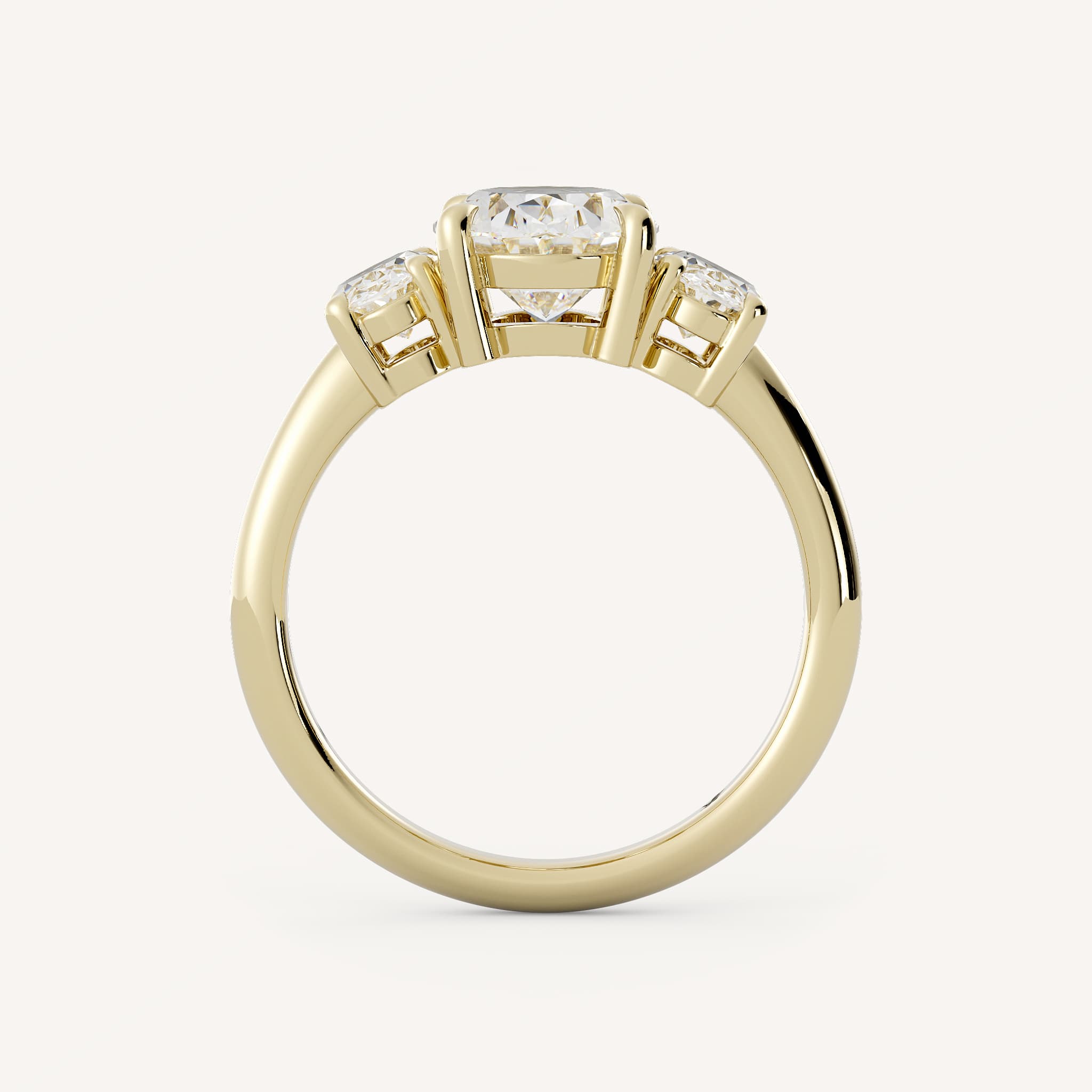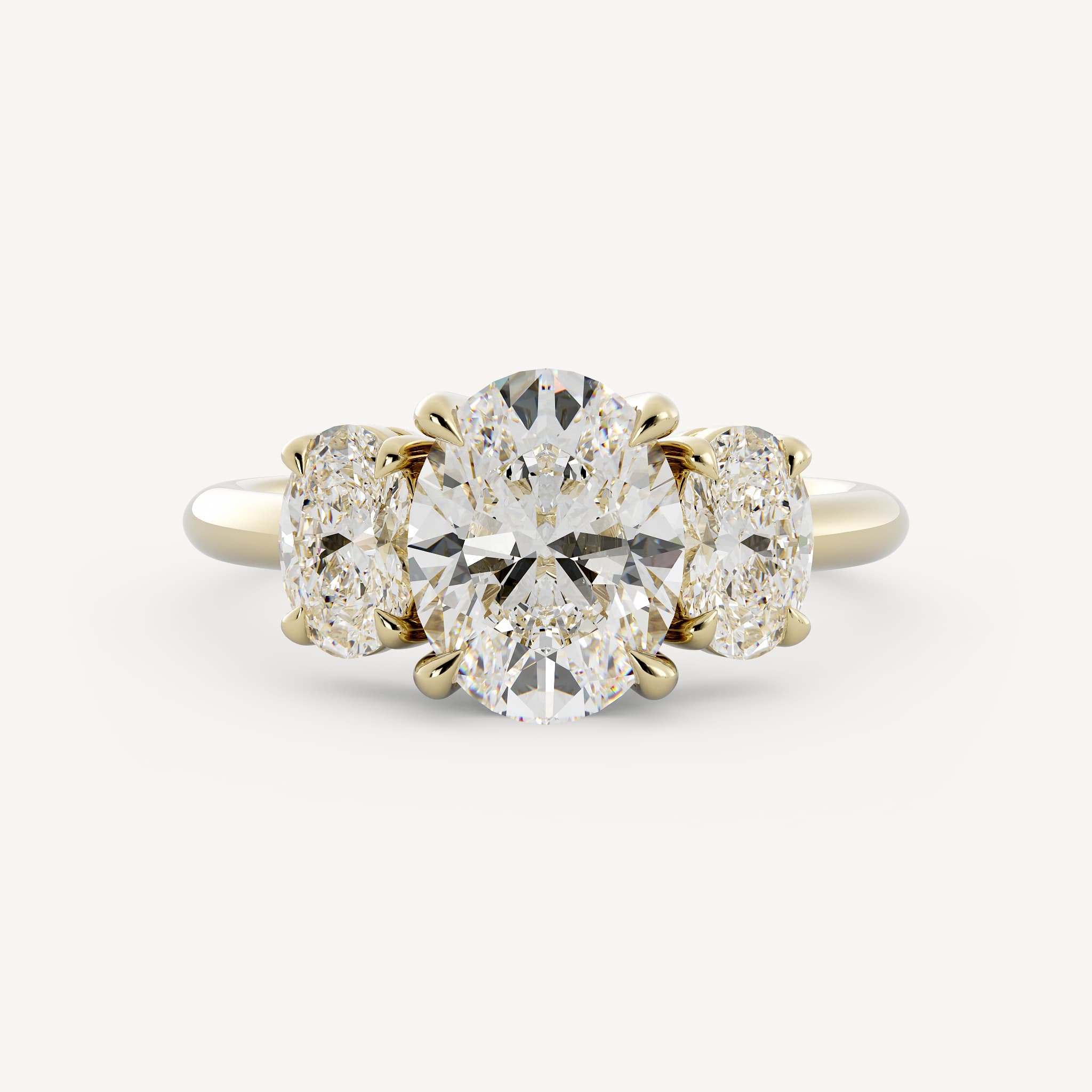 Cicely features a stunning oval center stone with two oval side stones set with claw prongs in a three stone setting on a half round shank.