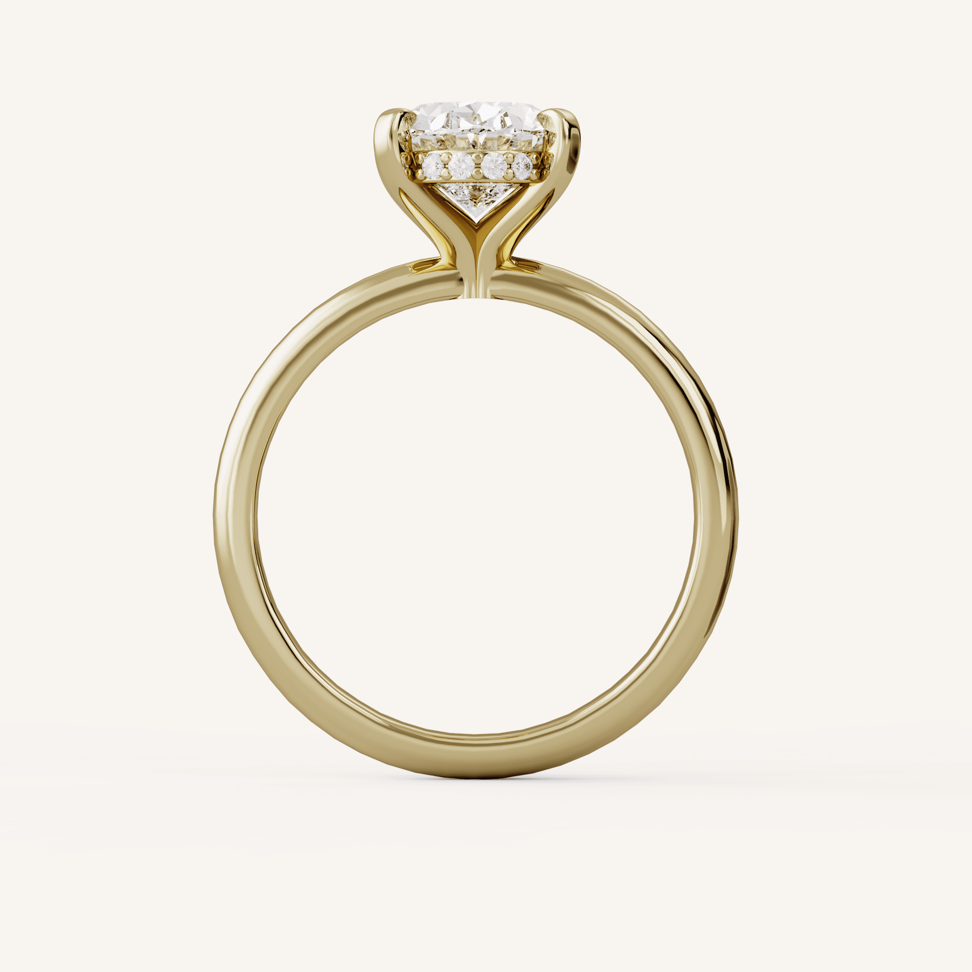 Ellison features a stunning oval center stone with a delicate hidden halo set in a traditional solitaire setting on a half round shank.