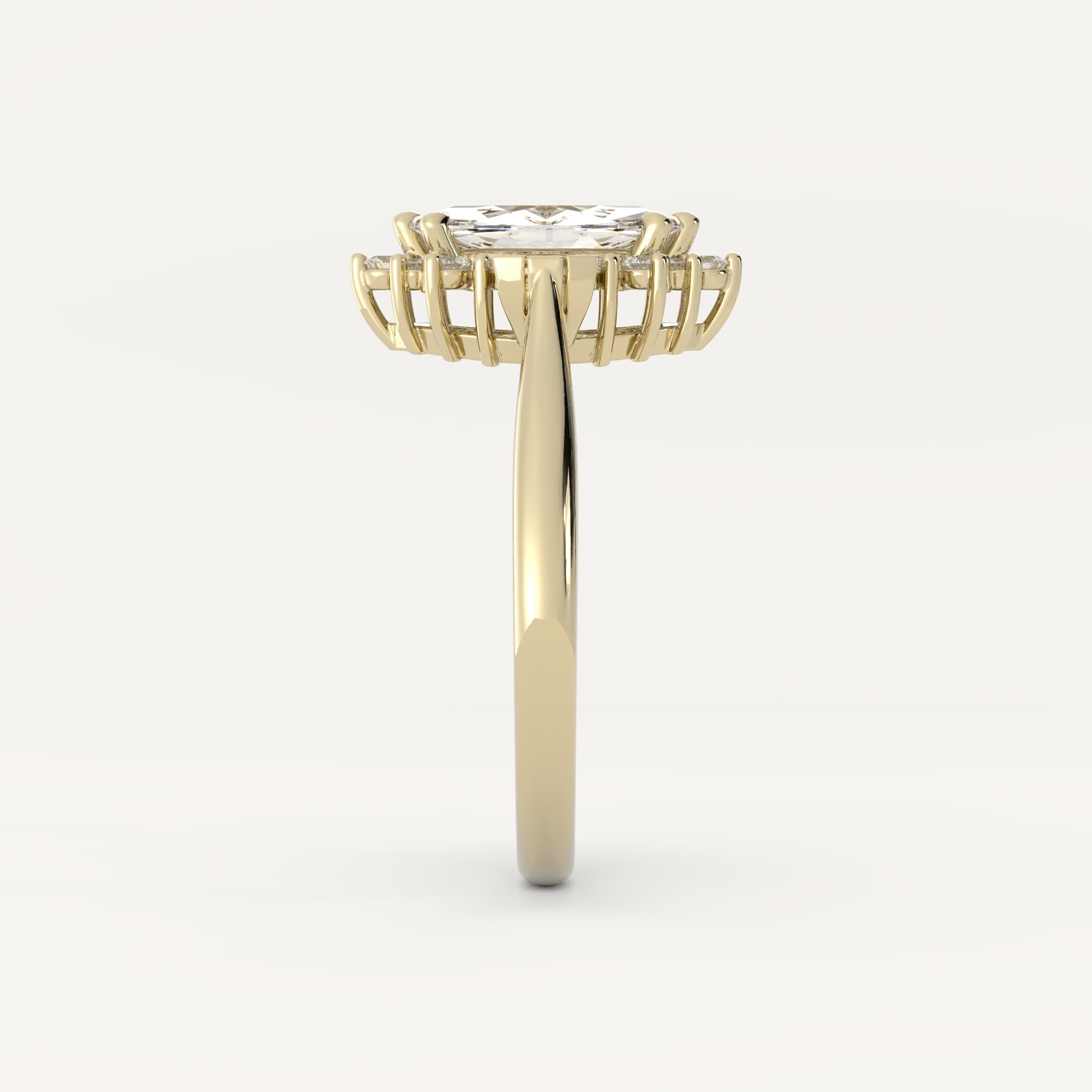 Emerson features a marquise center stone set in a vintage burst halo made of baguette and round stones. This design is set in a cathedral basket on a pinch tapered shank.