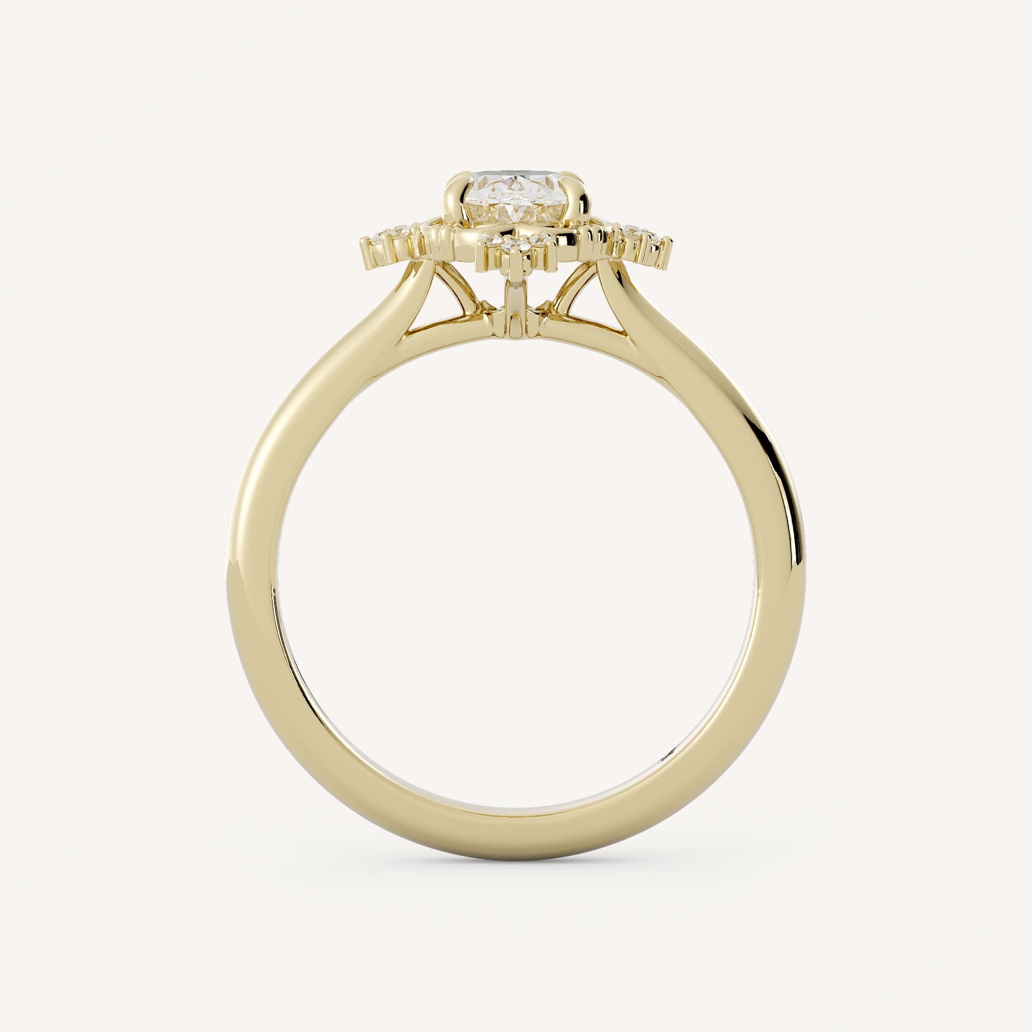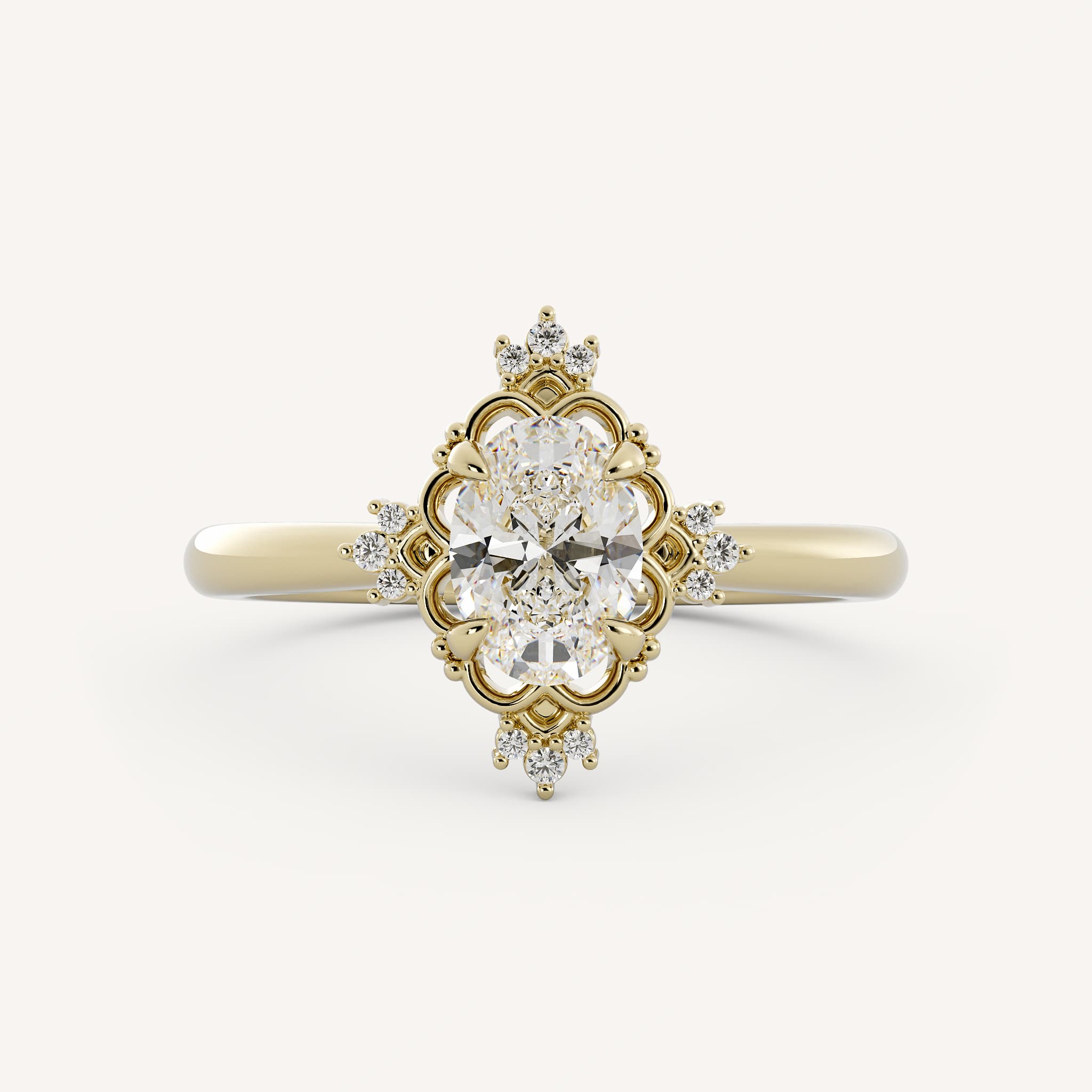 Polly features an oval center stone surrounded by an ornate halo with clusters of round diamonds set in a cathedral setting on a half round flat edge shank.