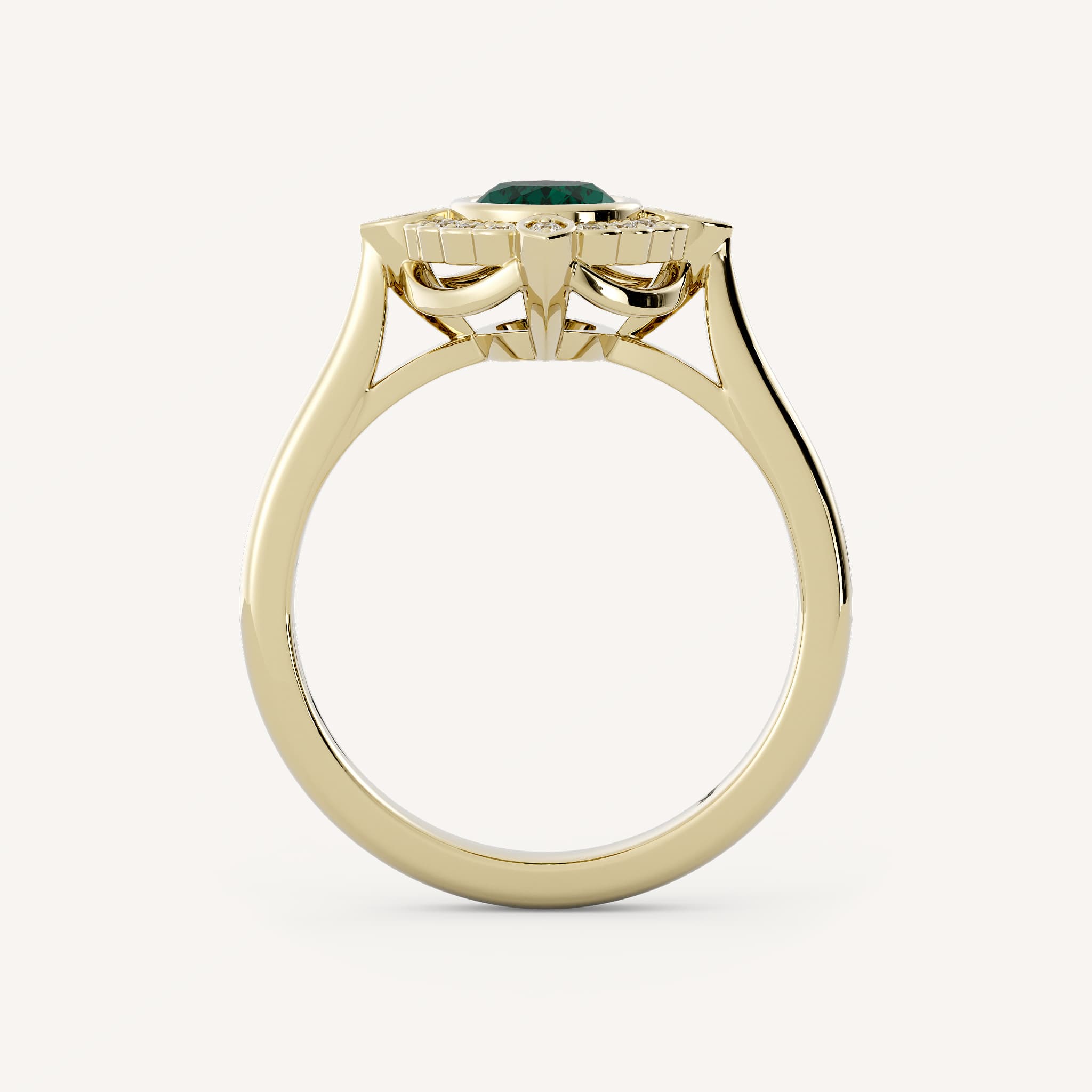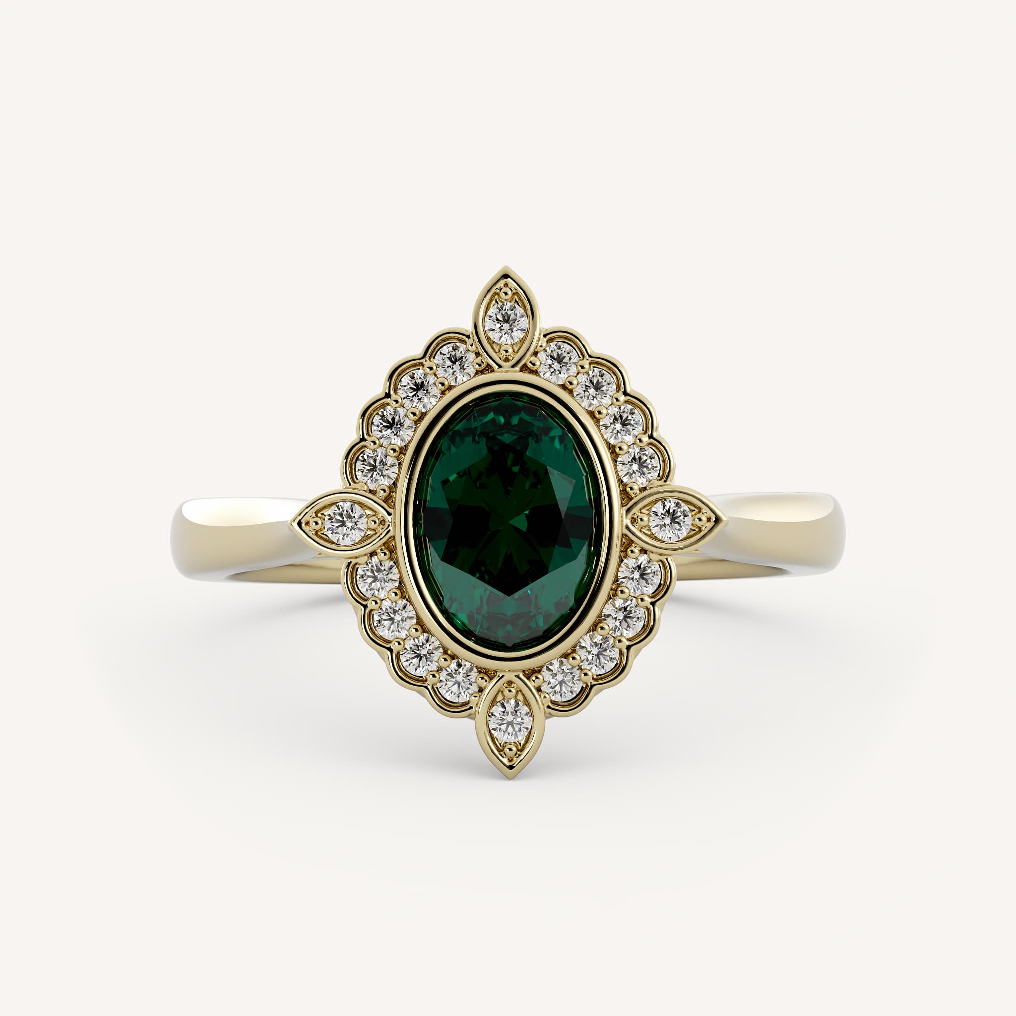 Valley features an oval shaped emerald center stone with a vintage inspired channel prong halo set in a basket setting on a half round shank.