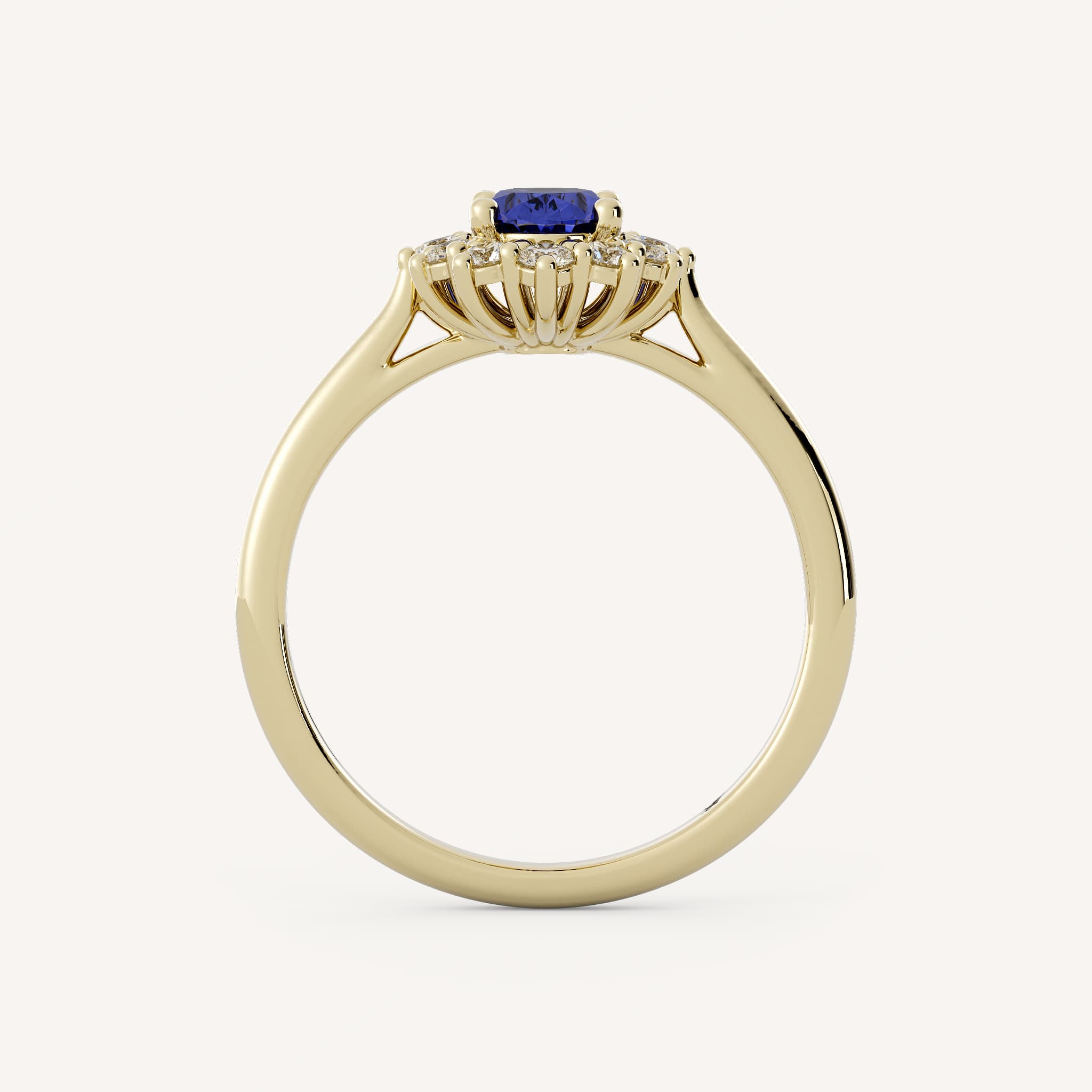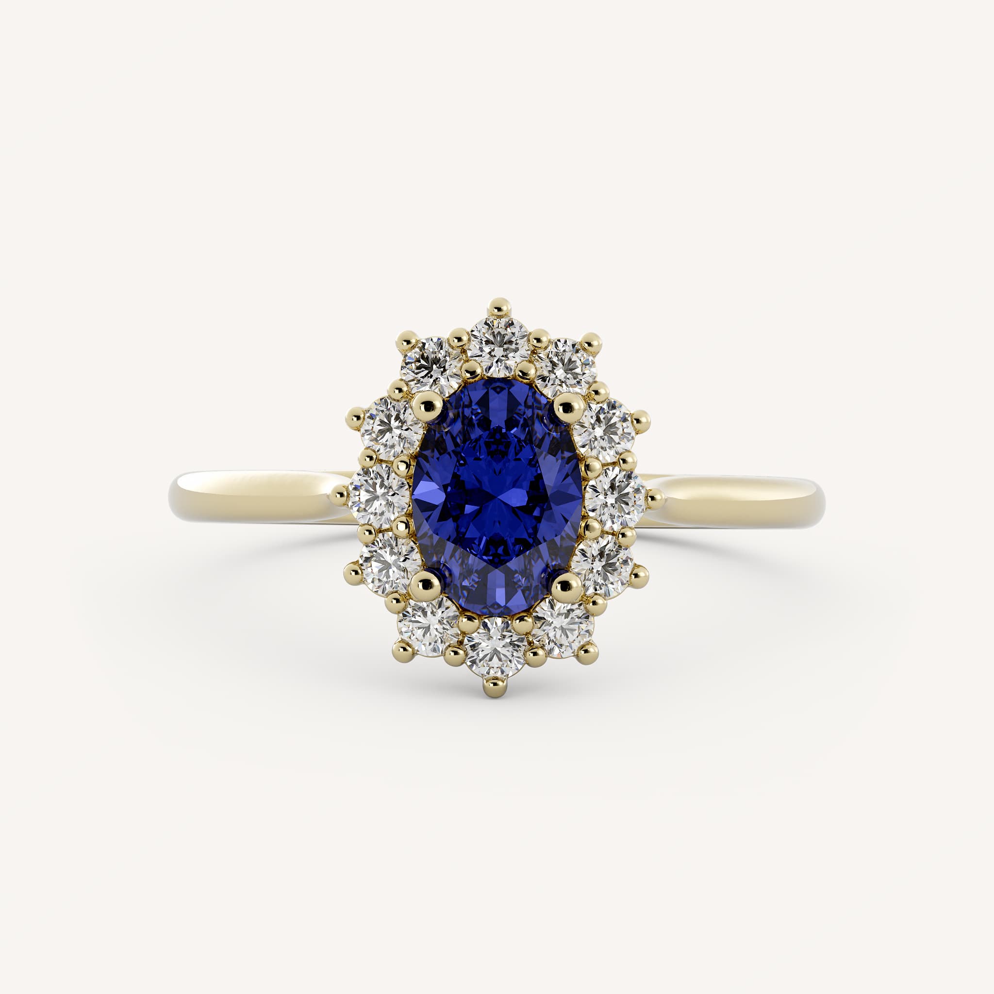 Rachel features an elegant oval blue sapphire center stone with a burst halo in a cathedral basket setting with a half round shank.