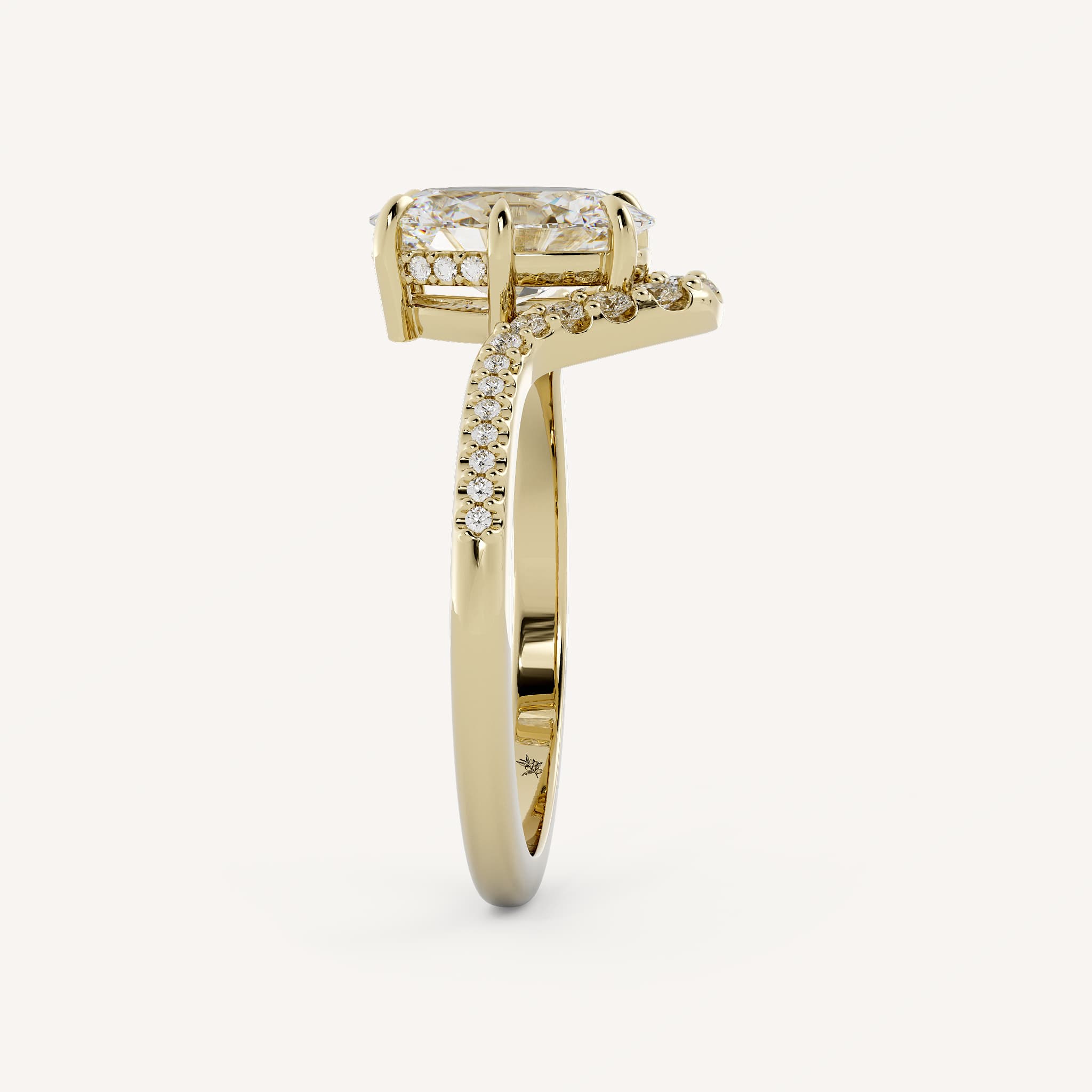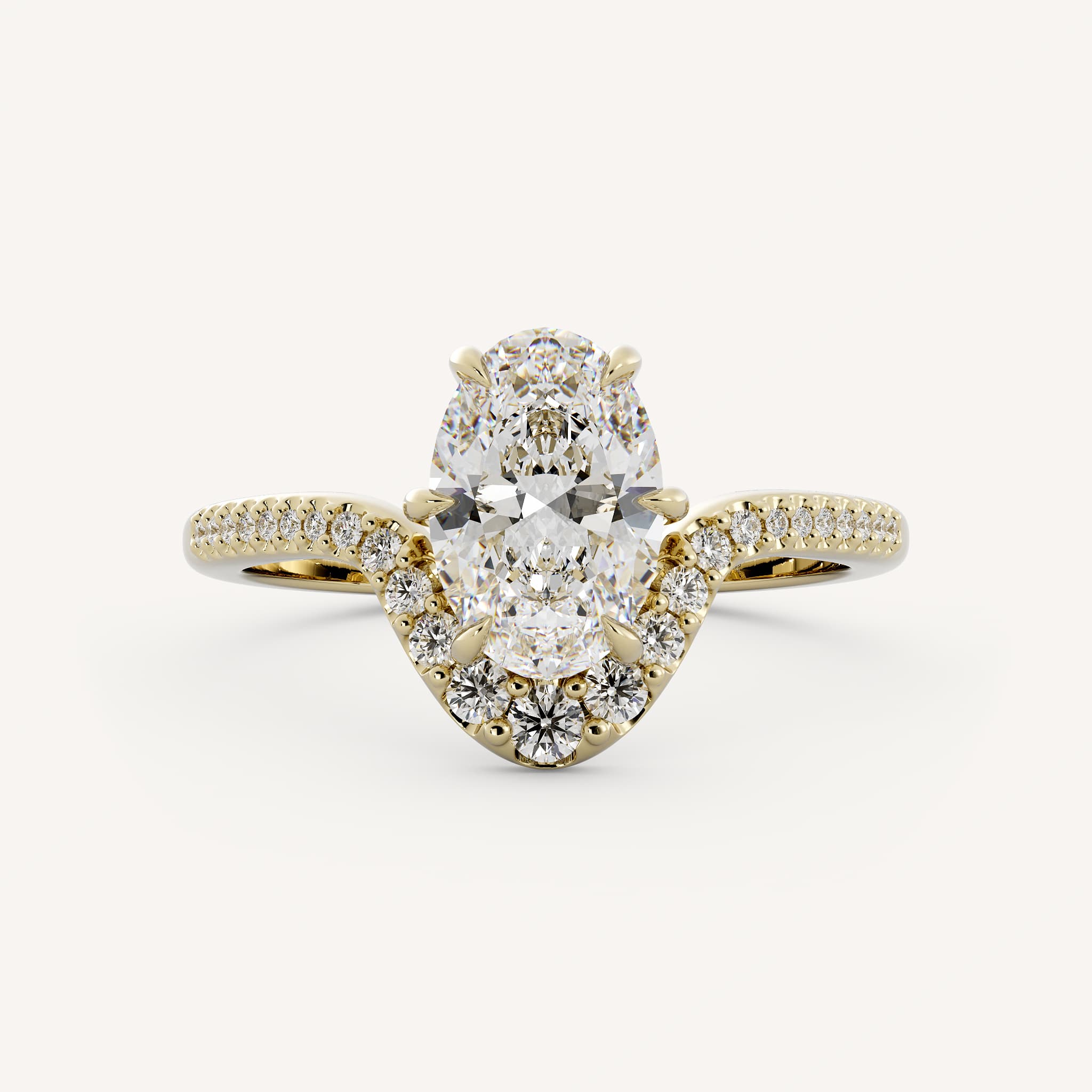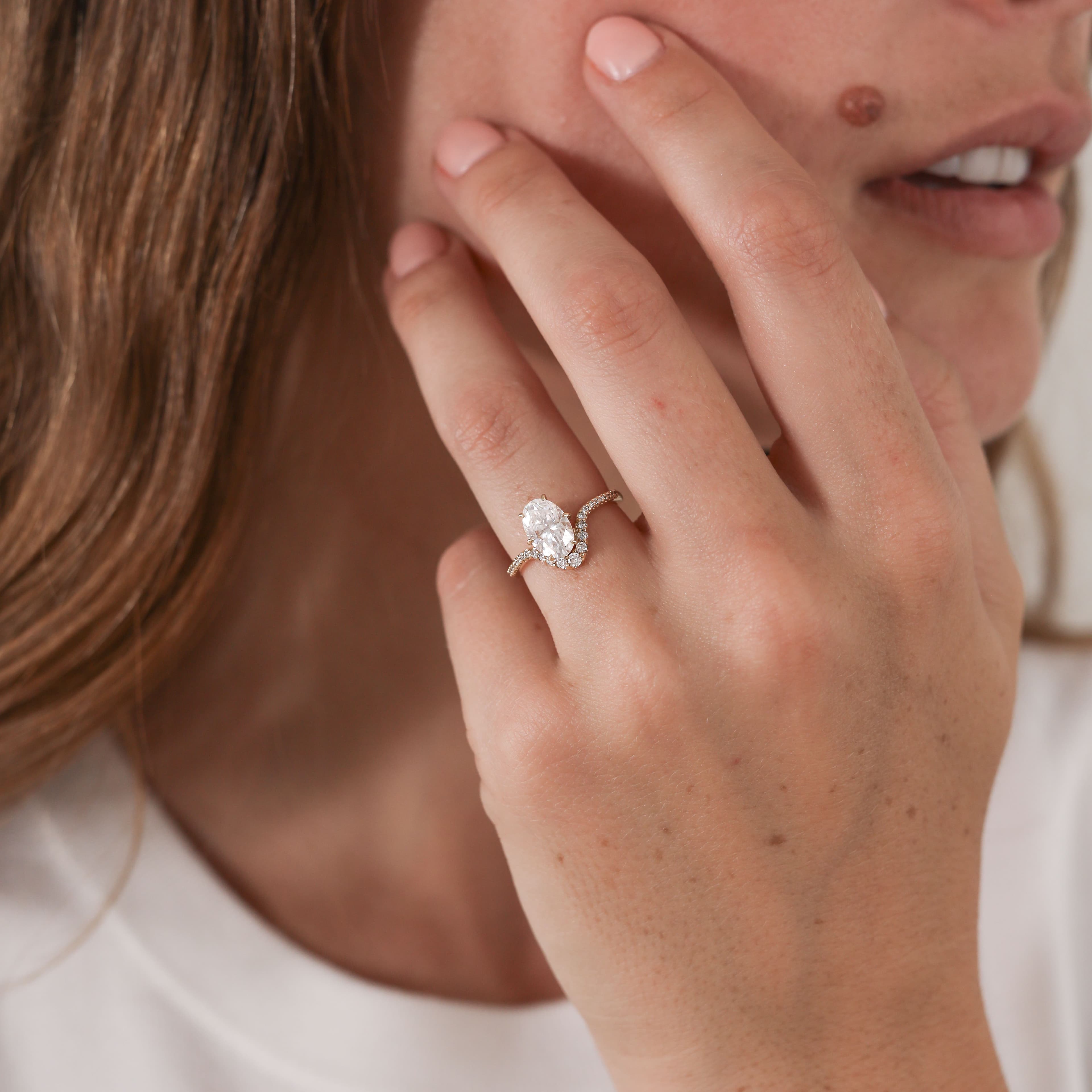 Amorette features an elongated oval center stone set with six claw prongs on a contoured shank with cascading diamonds. This design features half a hidden halo on the open side.