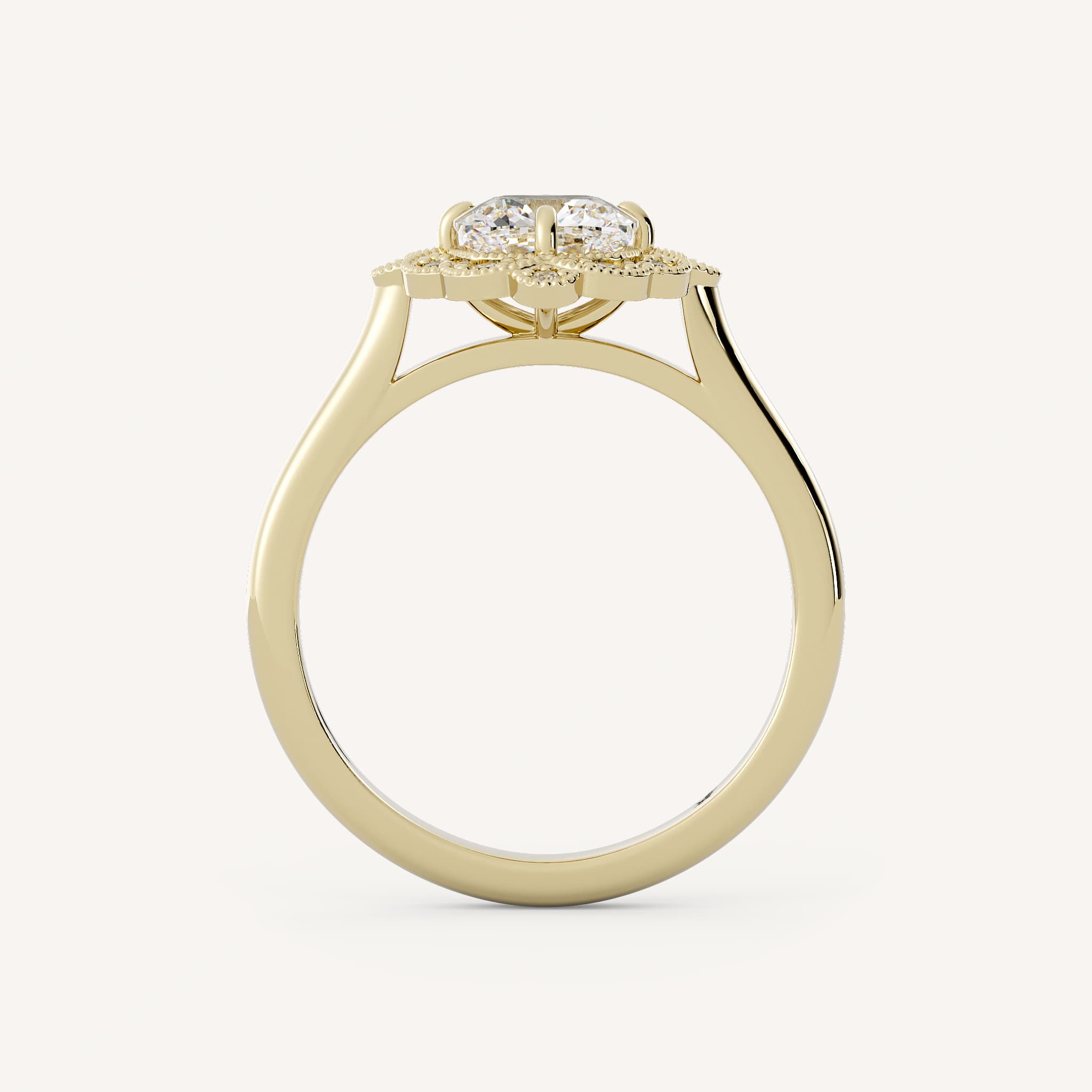 Bloom features a cushion center stone with a stunning channel prong halo and milgrain detail set in a cathedral setting on a half round shank.