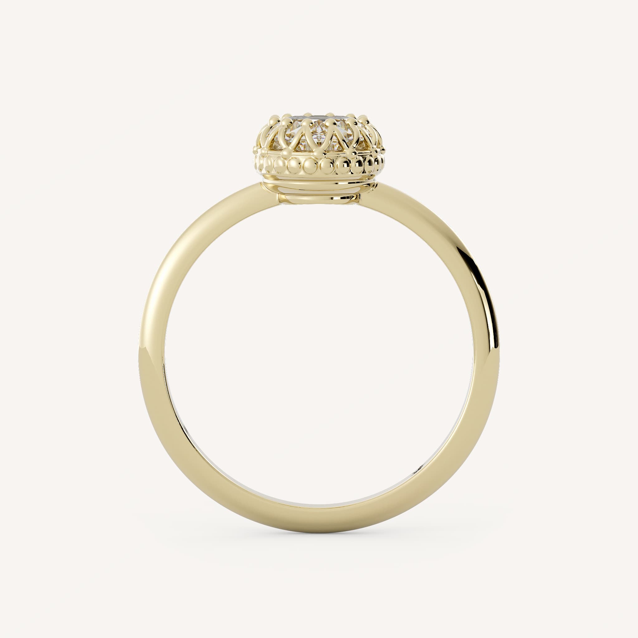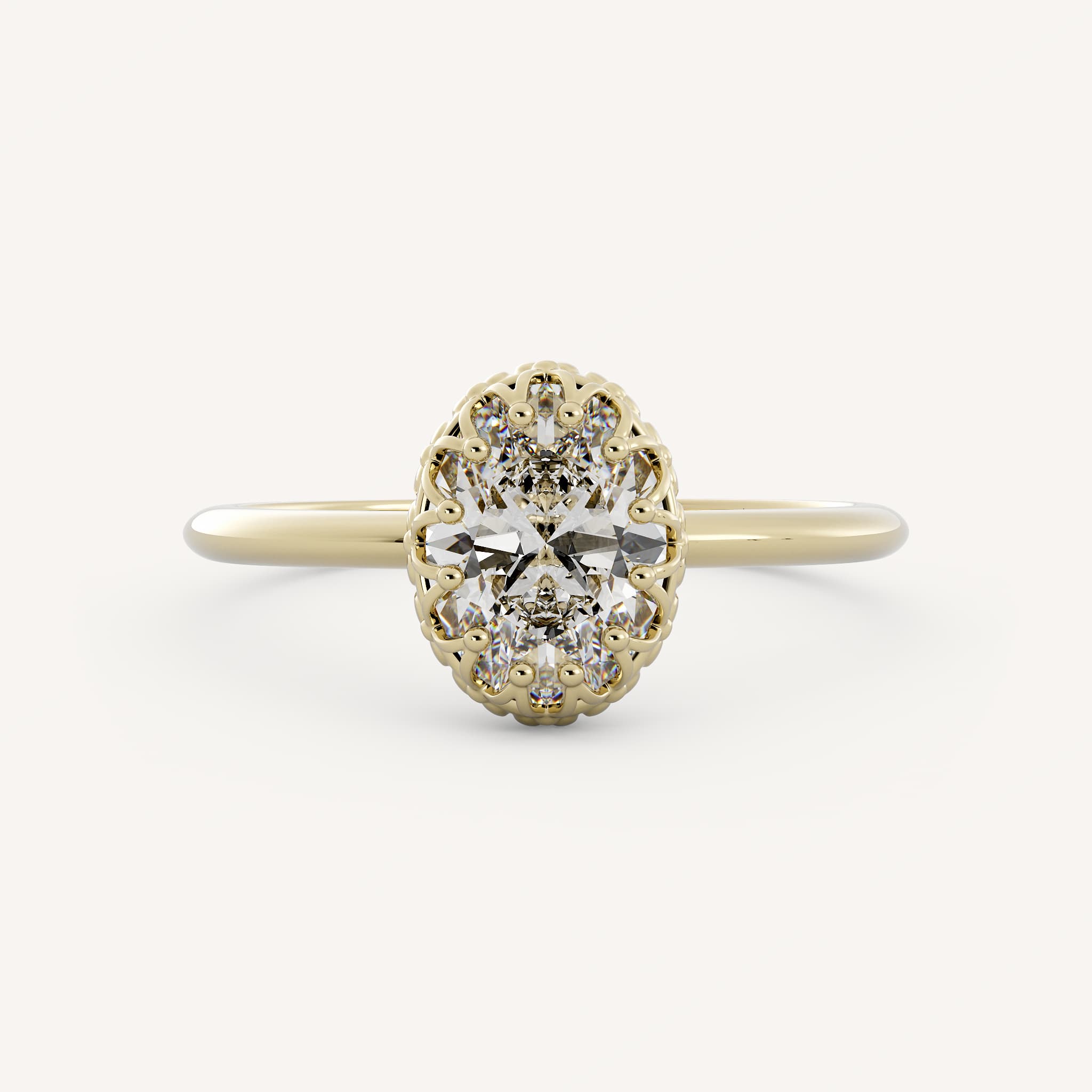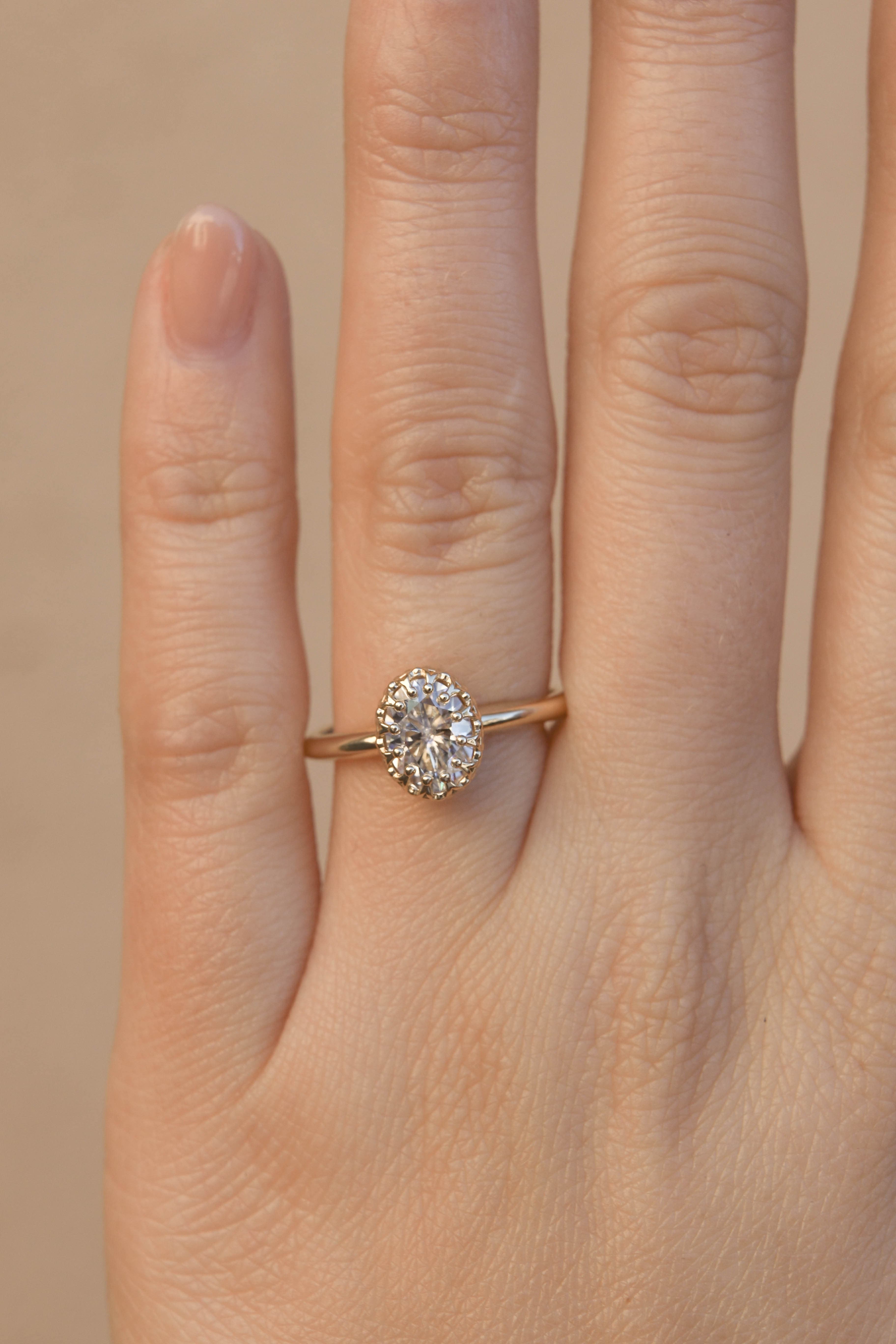 Lou features an oval center stone in a twelve-prong bezel setting with gold detail on a half round shank.