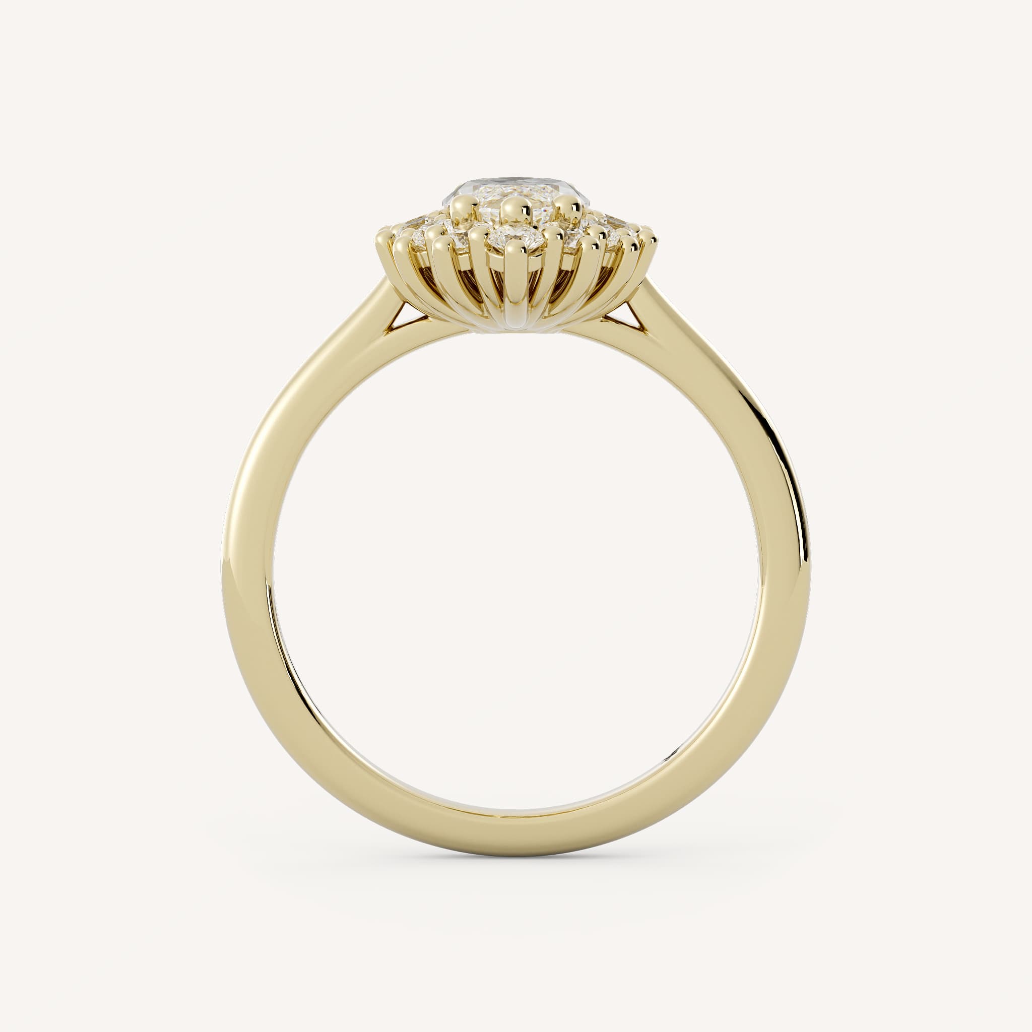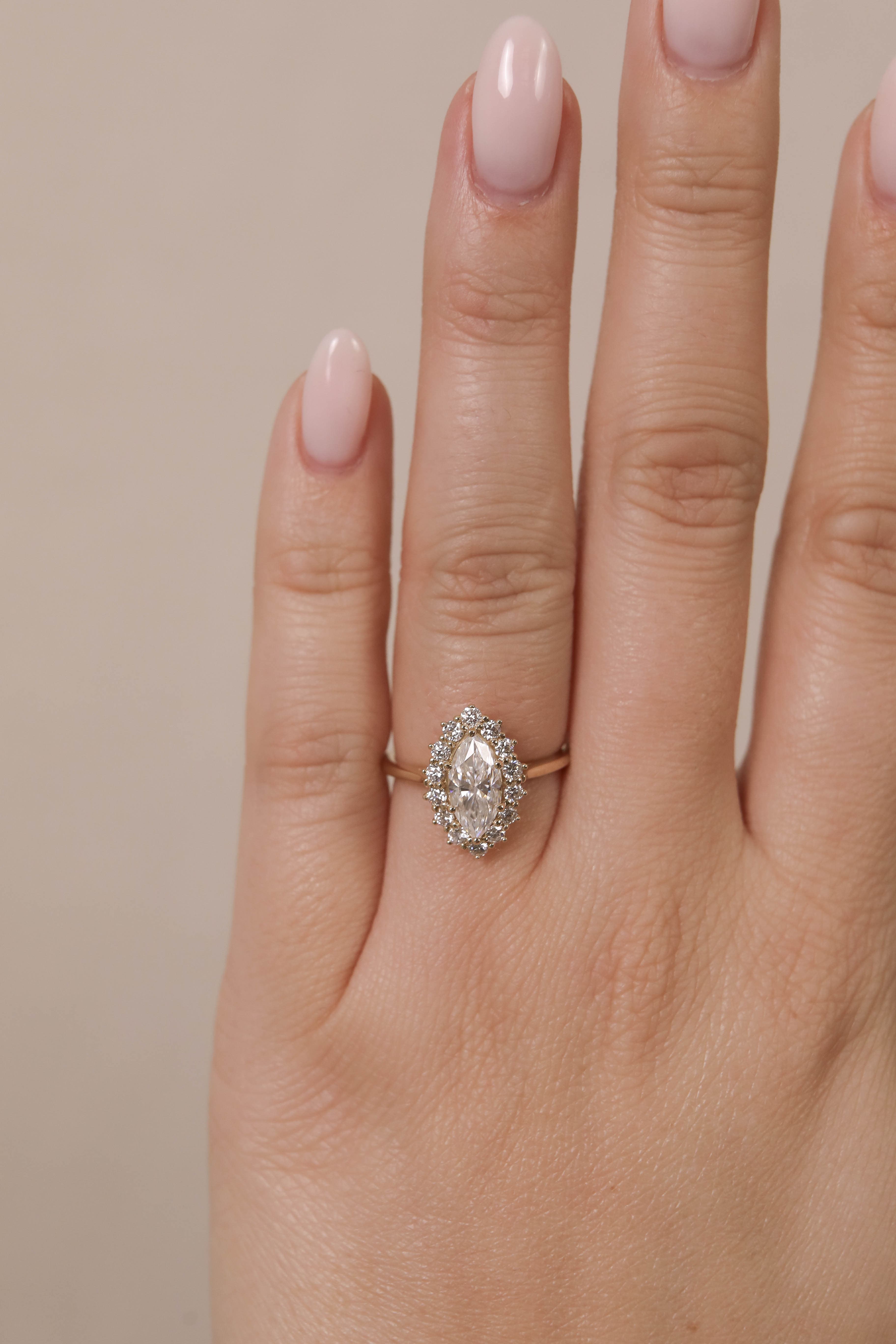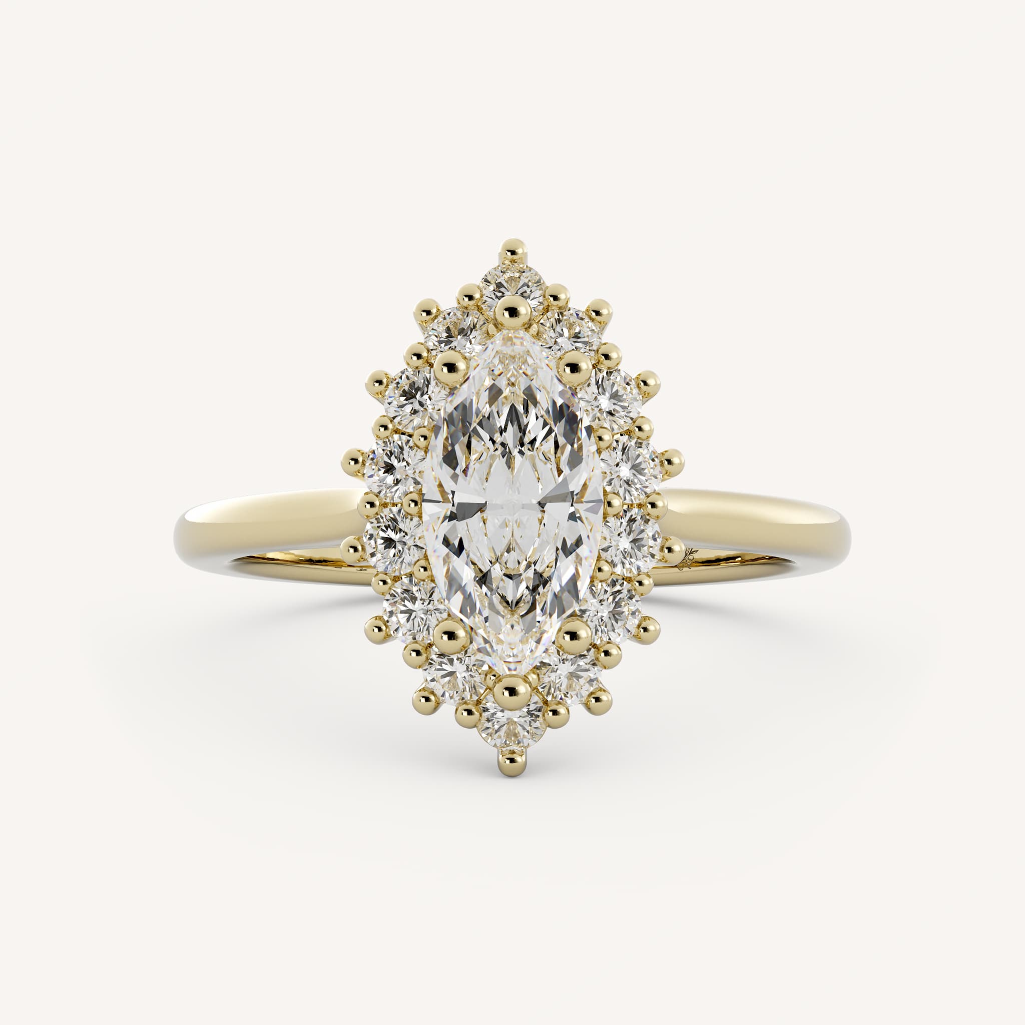 Madison features a dramatic marquise center stone with a burst halo set in a cathedral basket on a half round shank.