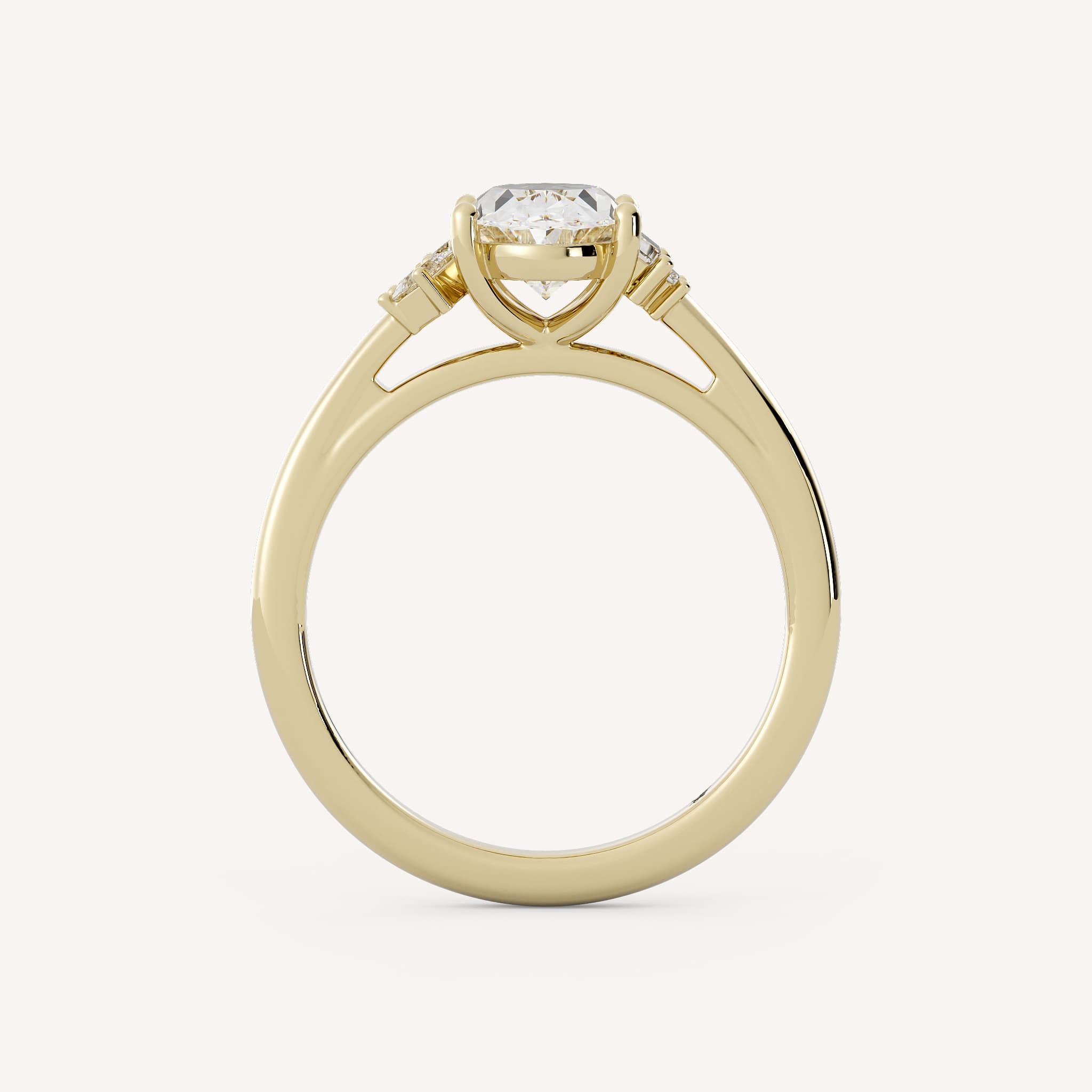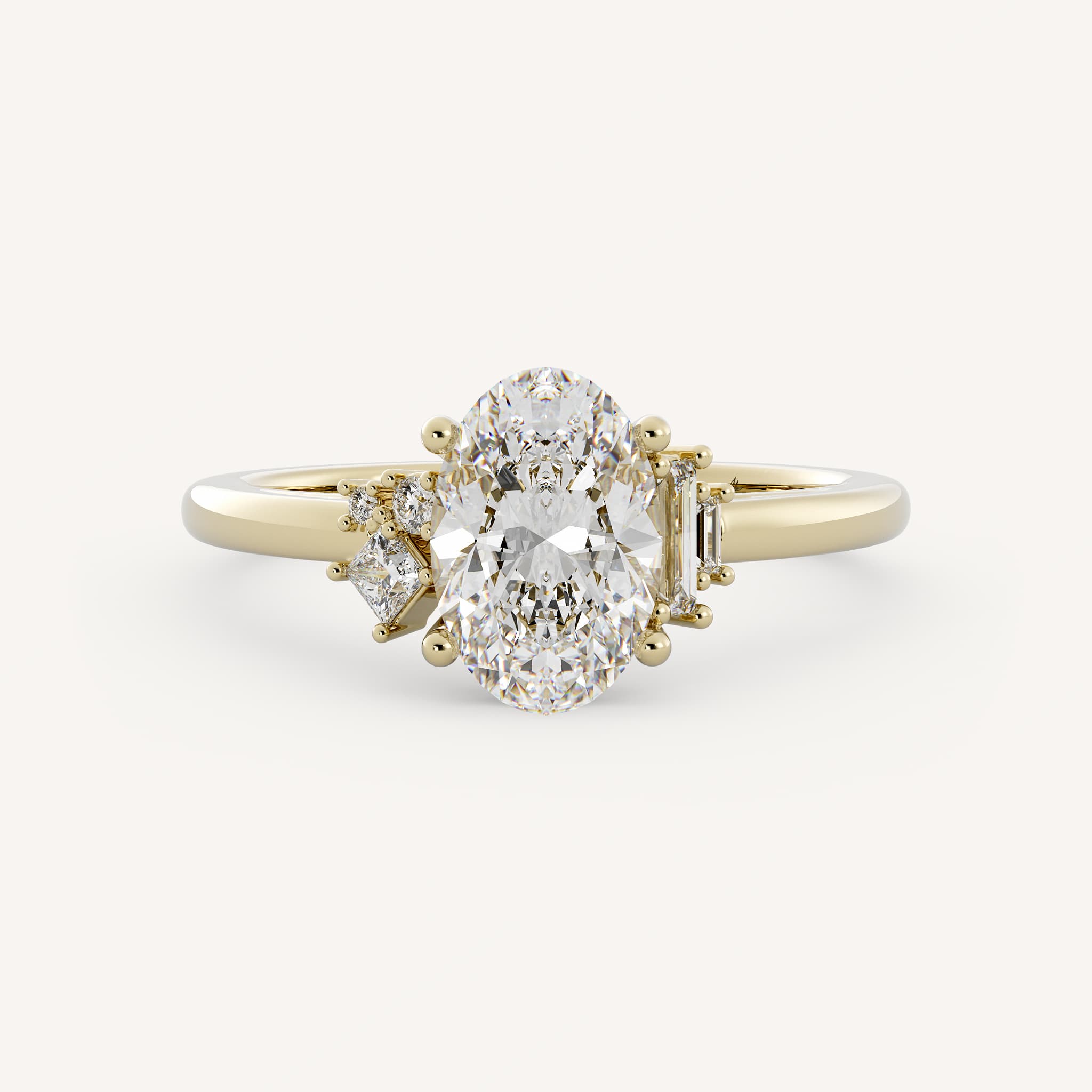 Zara features an elongated oval center stone with asymmetrical side clusters made of various shapes set in a cathedral setting on a half round shank.