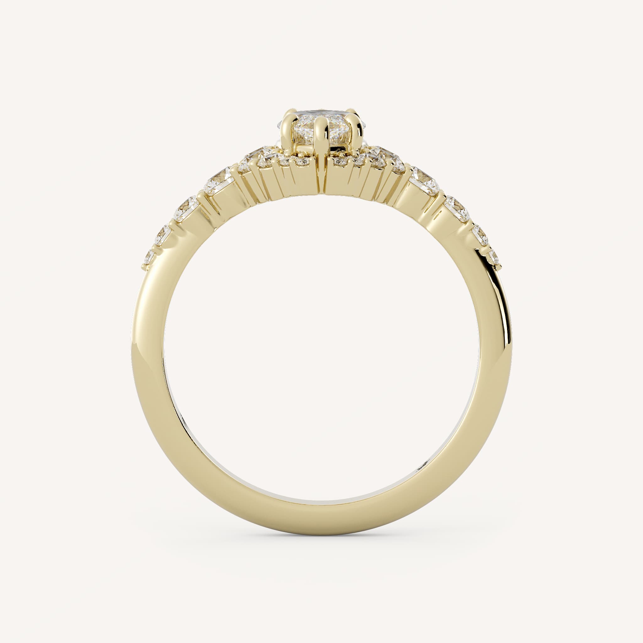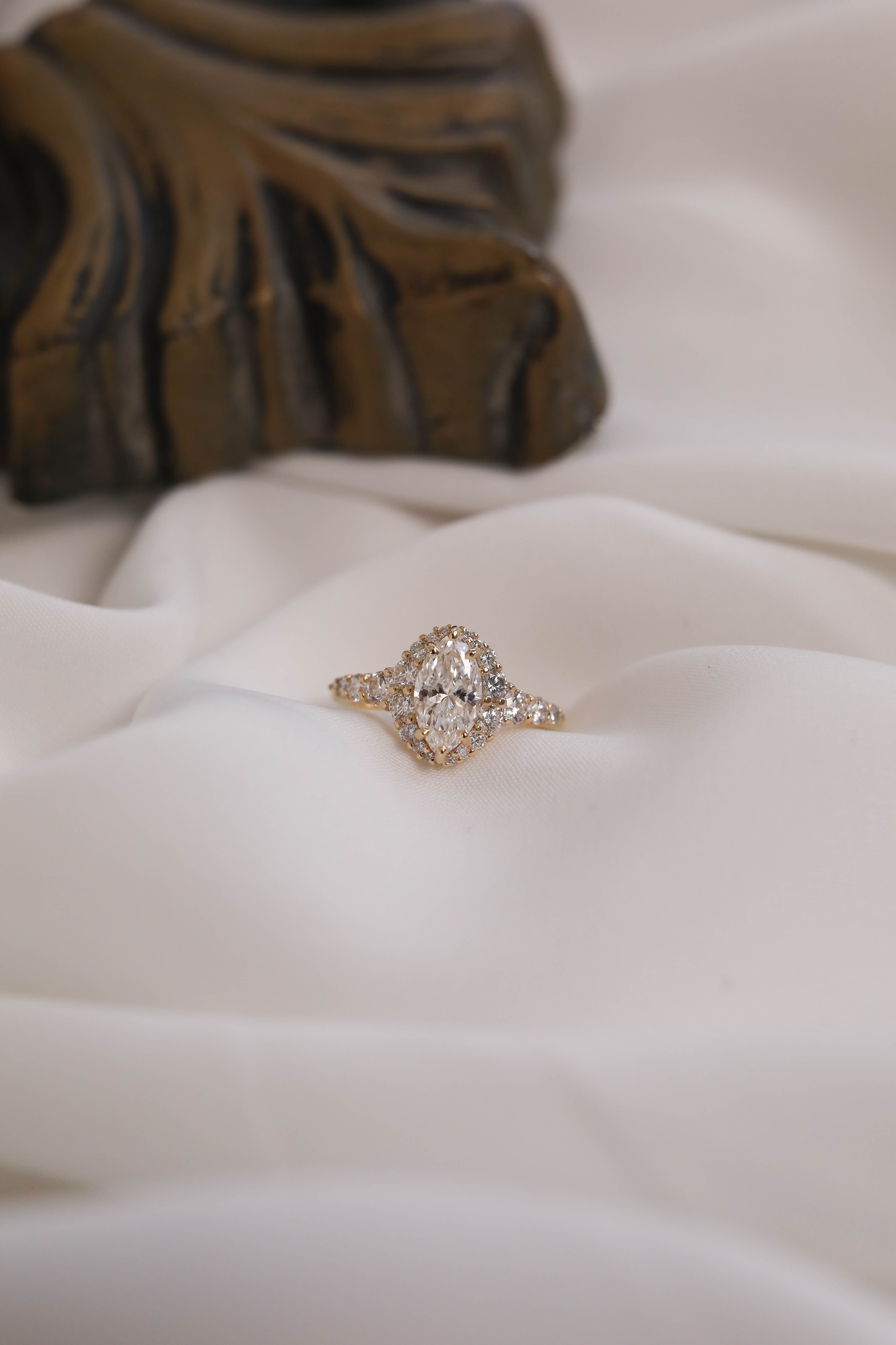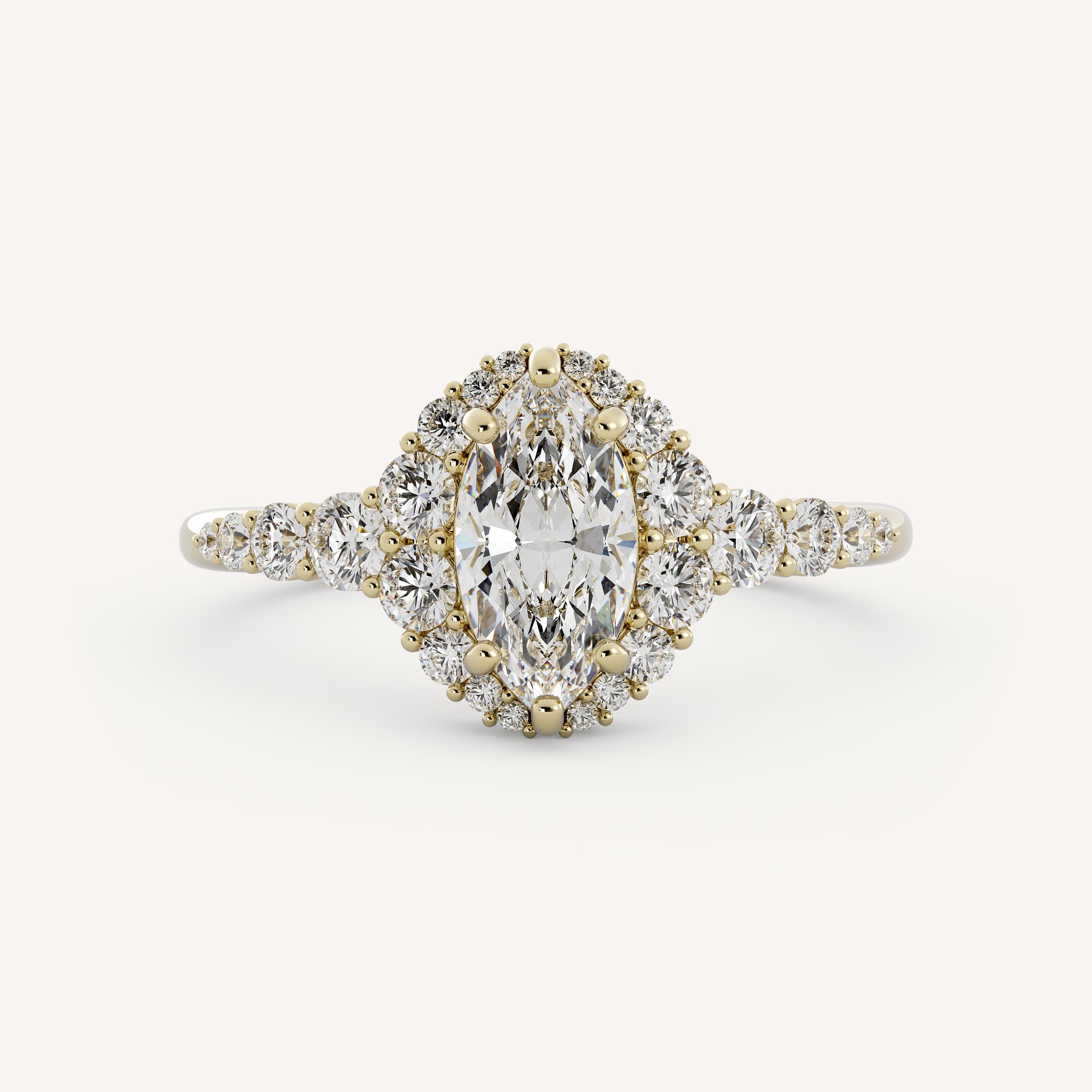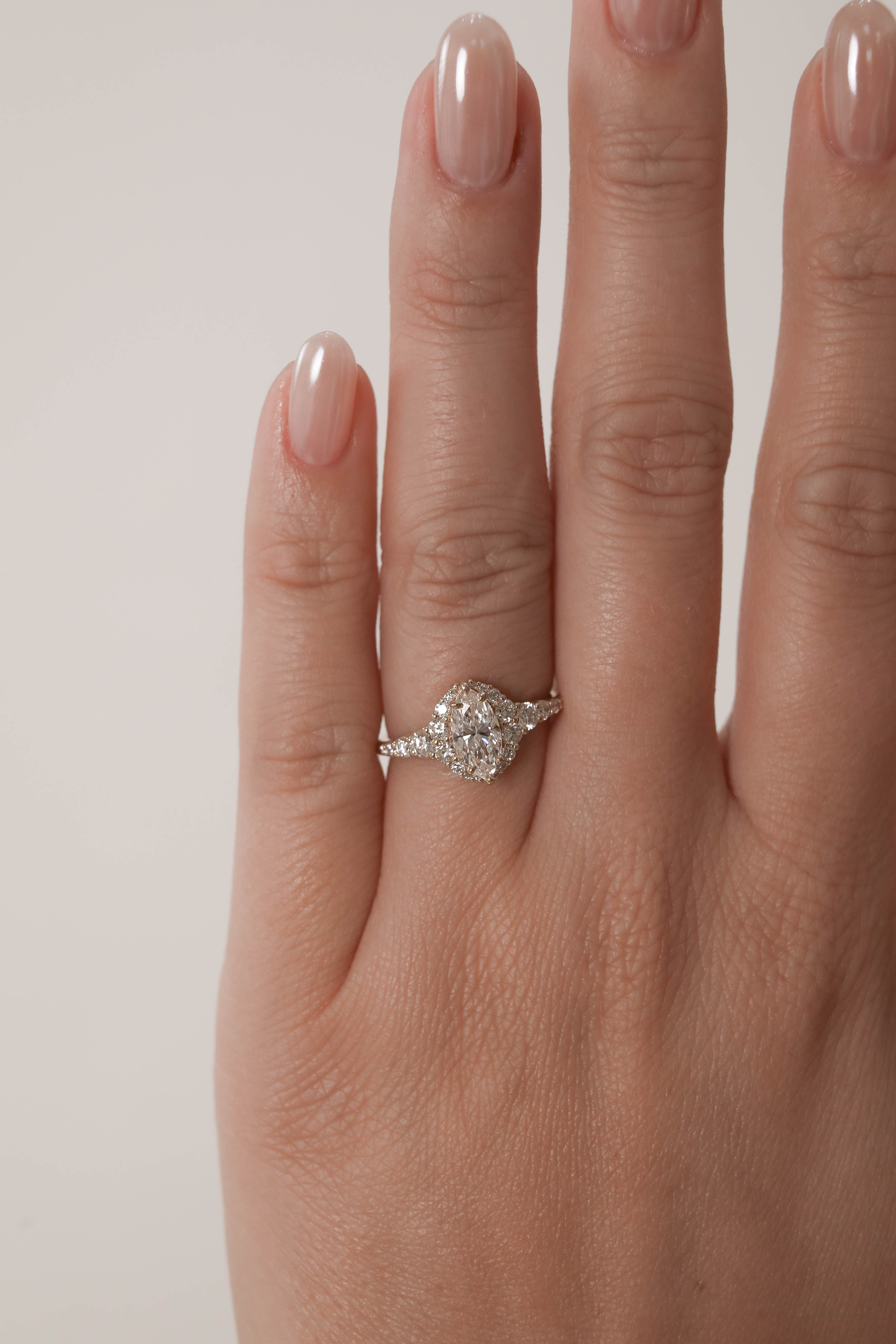 Jovie features a marquise center stone set flush in a cascading classic halo on a diamond accented tapered shank.