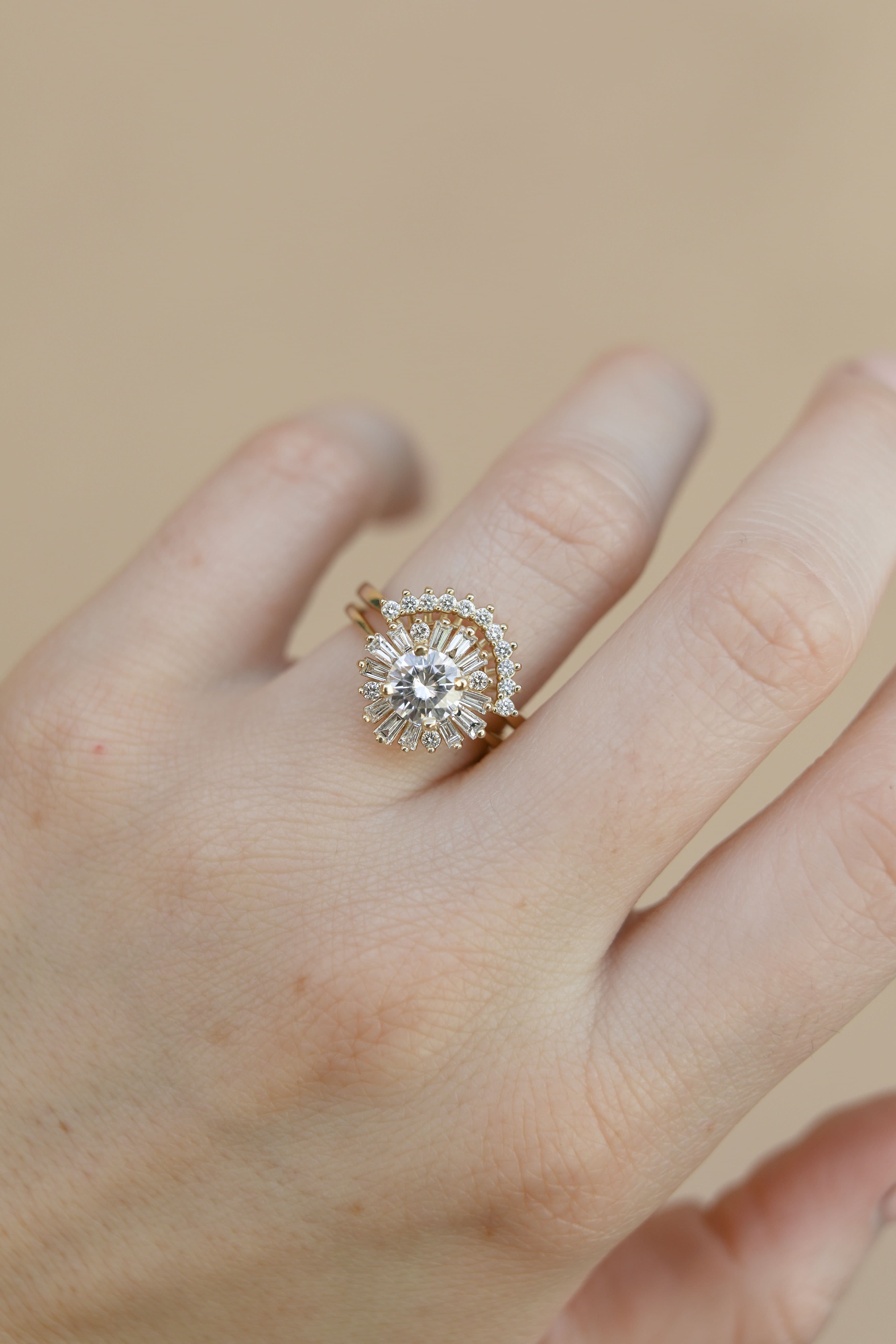 Pippa features a round center stone set in a whimsical halo made of baguette and round stones in a basket setting and half round shank. Paired with the Pippa Band which features a semi-circle basket setting with round stones made to pair perfectly with Pippa.