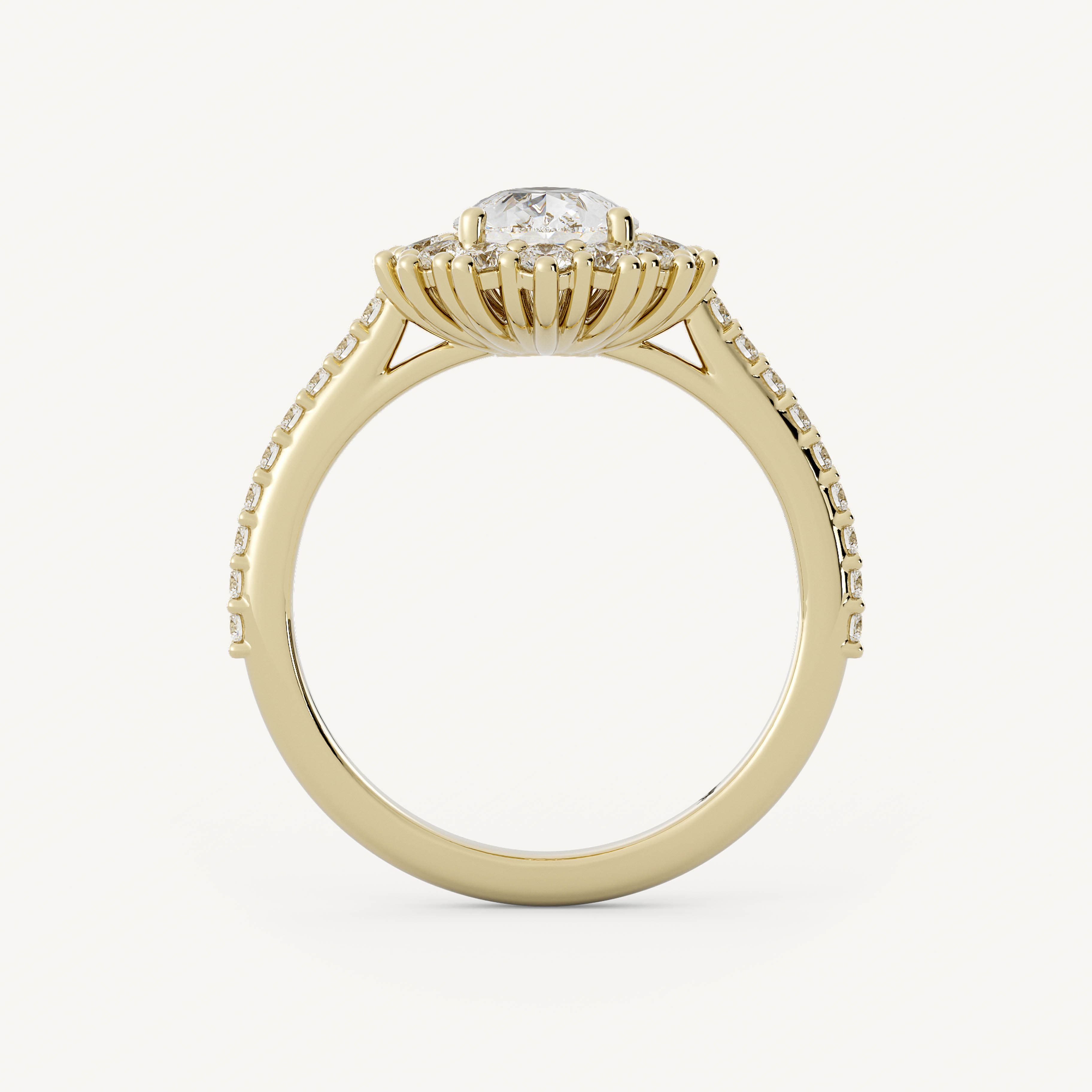 Amber features a pear center stone with a burst halo set in a cathedral basket setting complete with a traditional prong diamond shank.