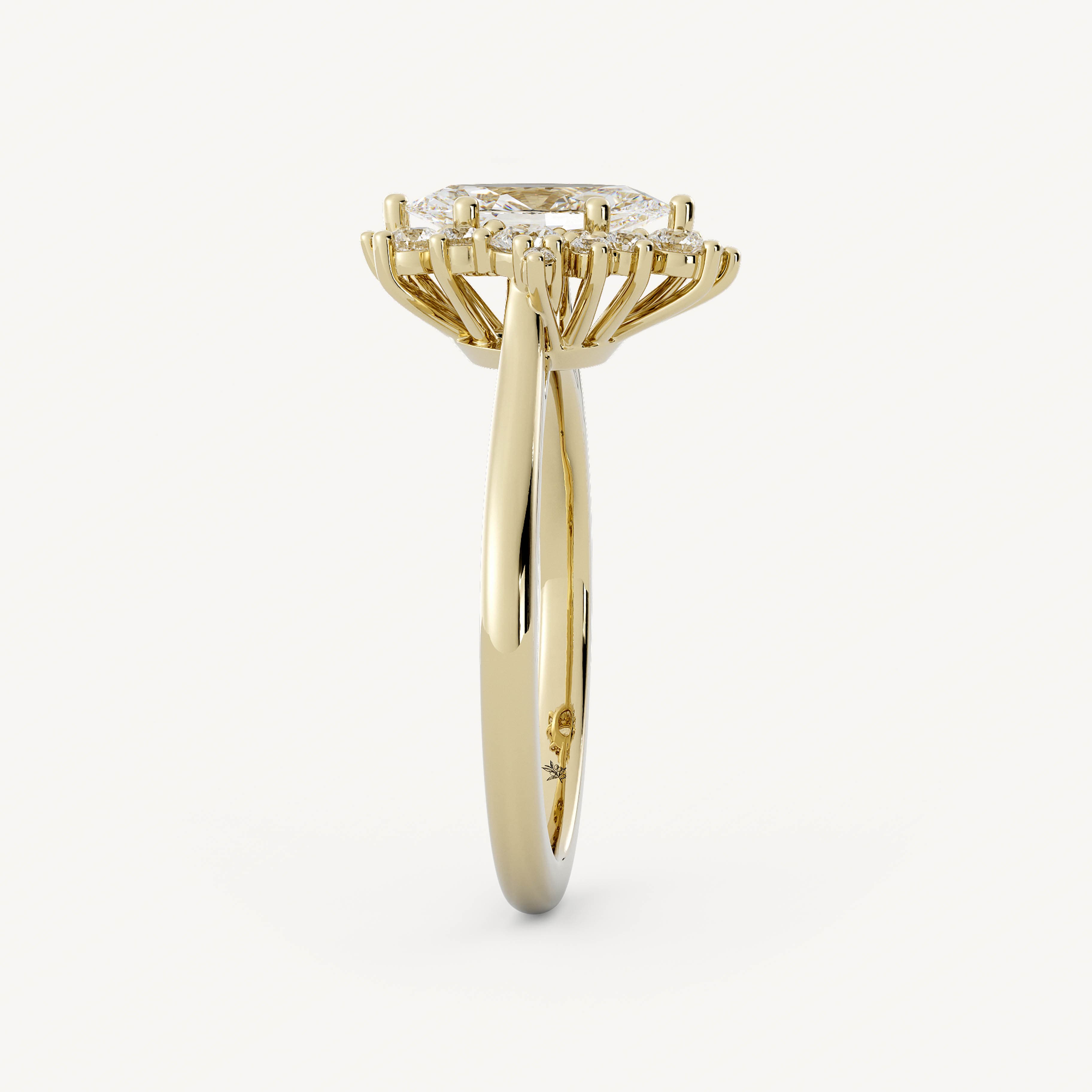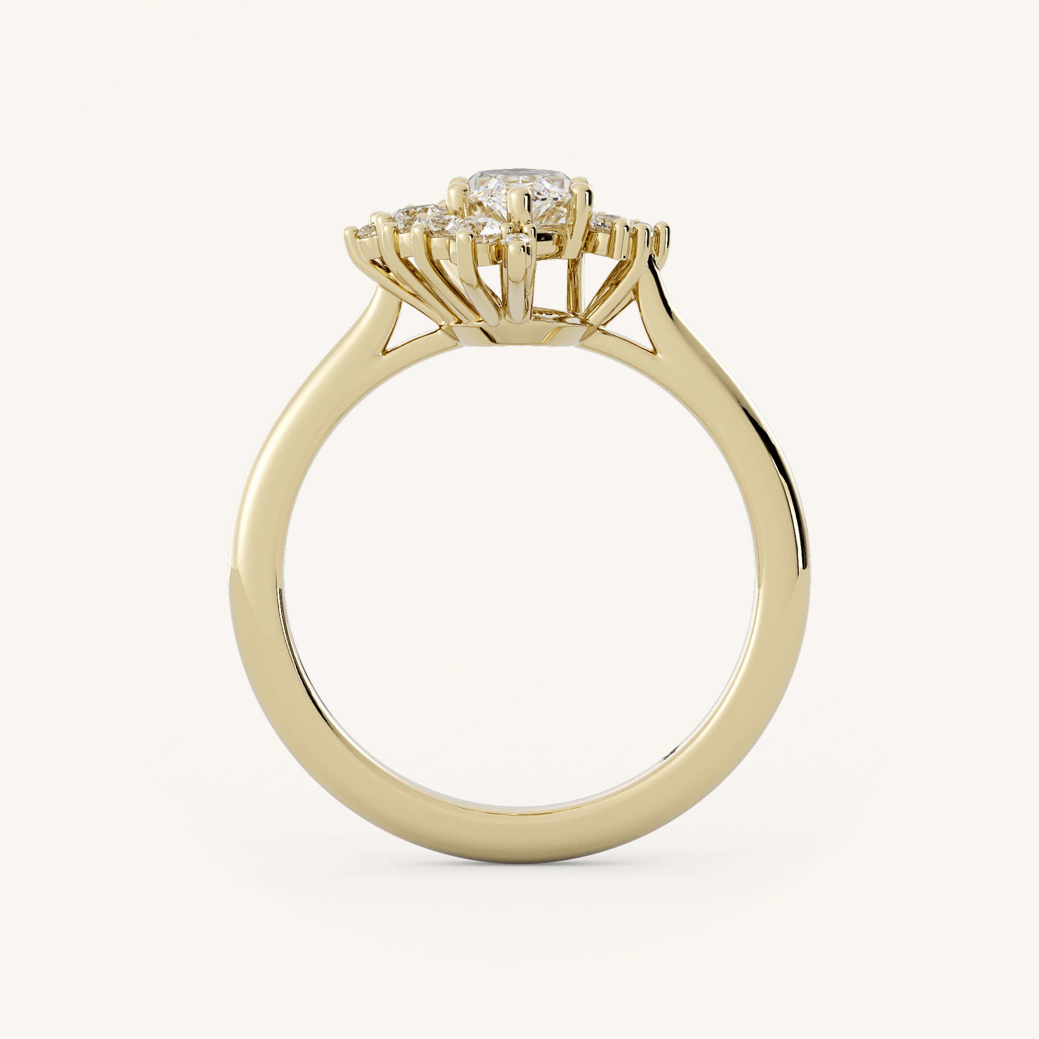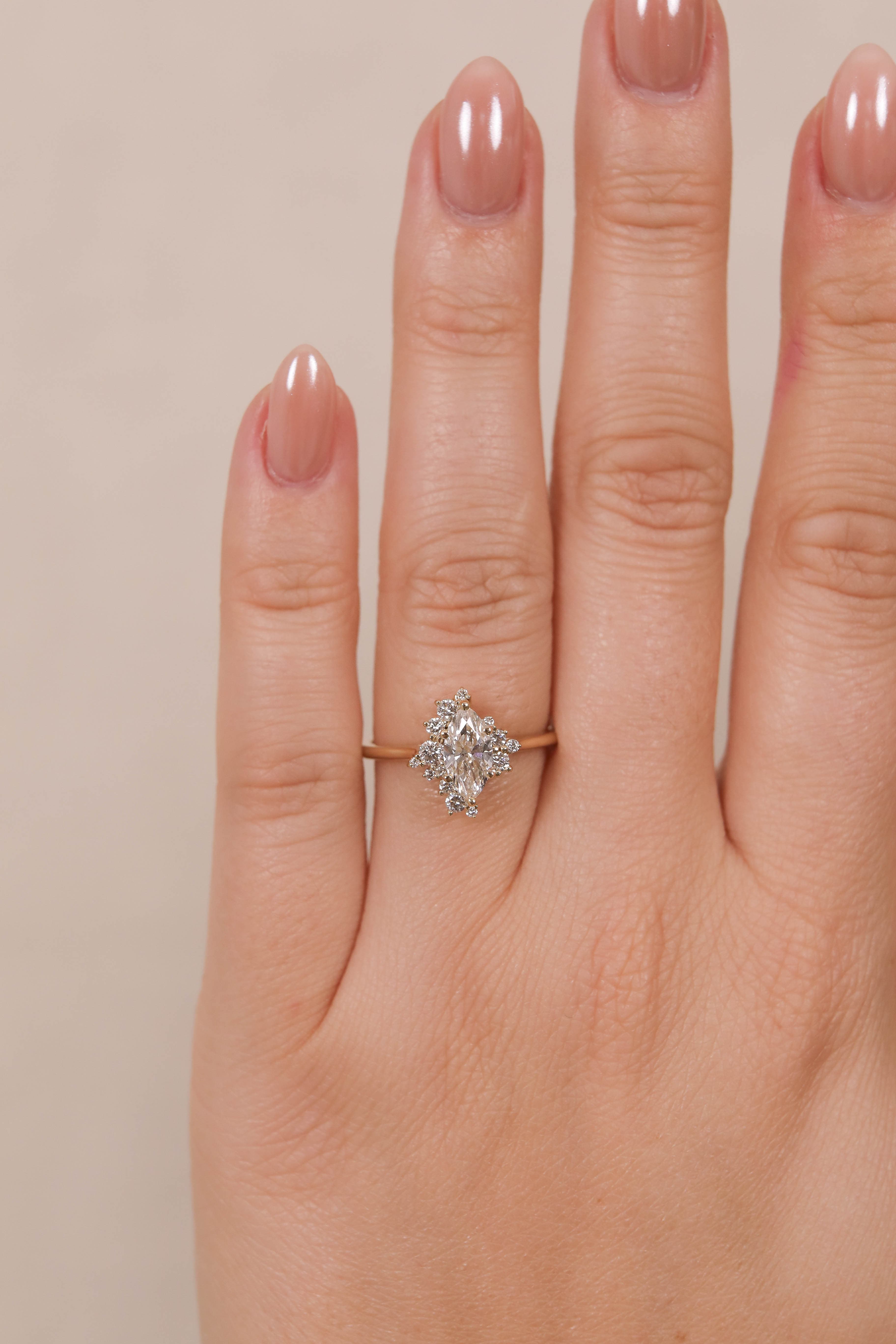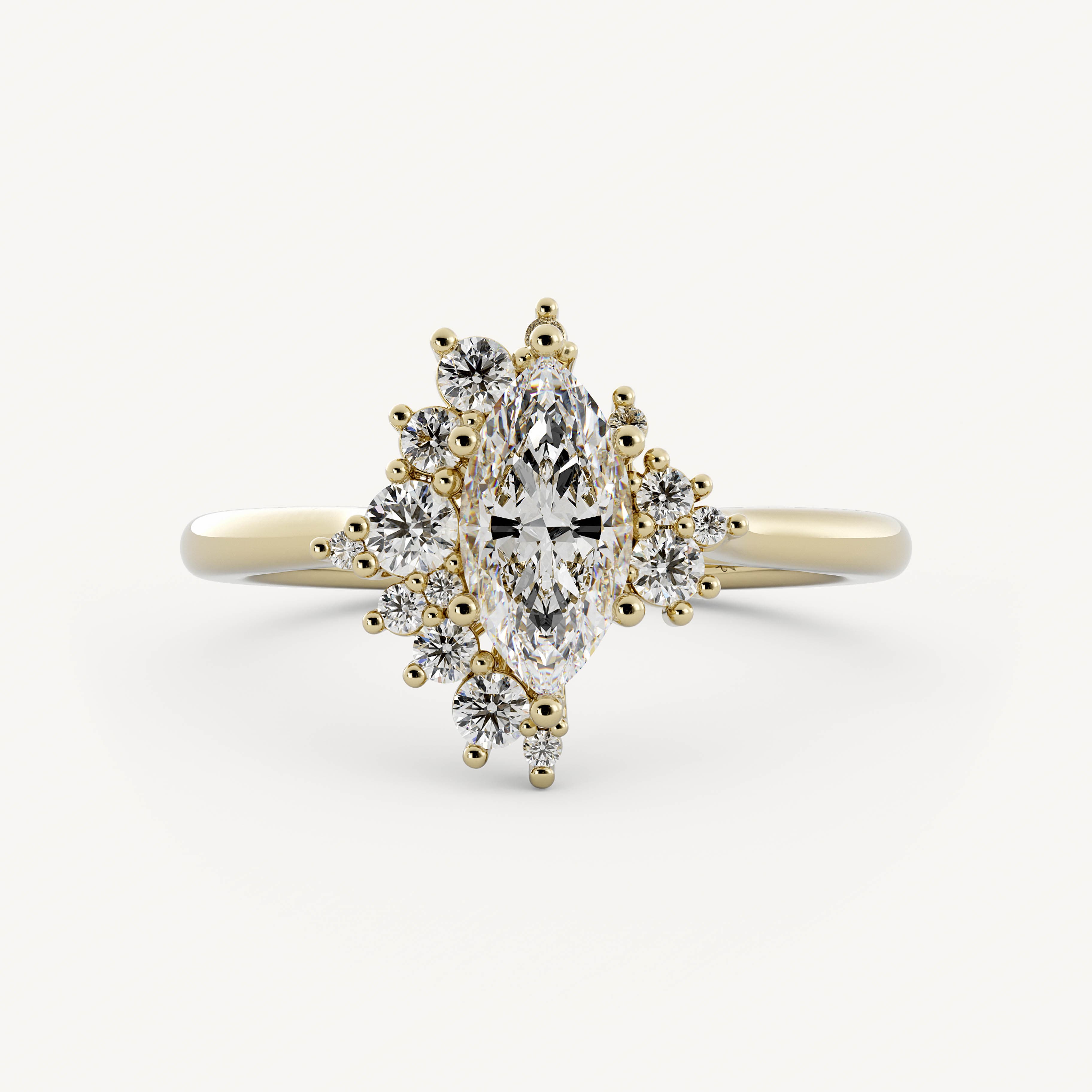 Austin features a marquise center stone with an asymmetrical burst halo set in a basket setting on a half round shank.
