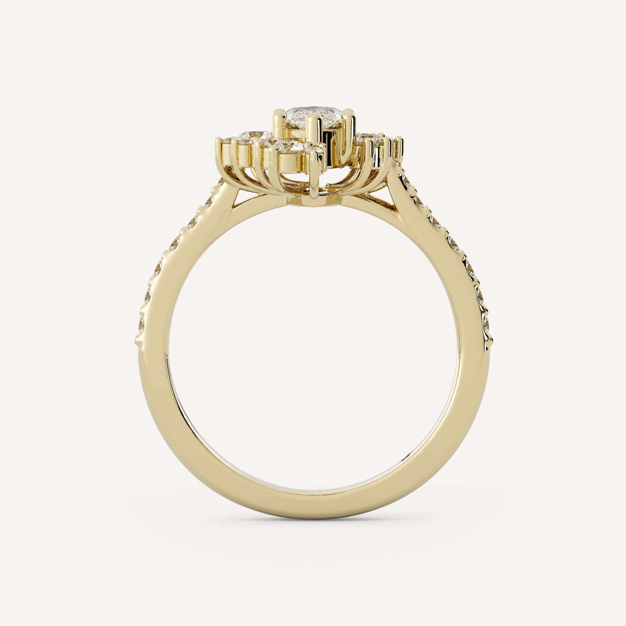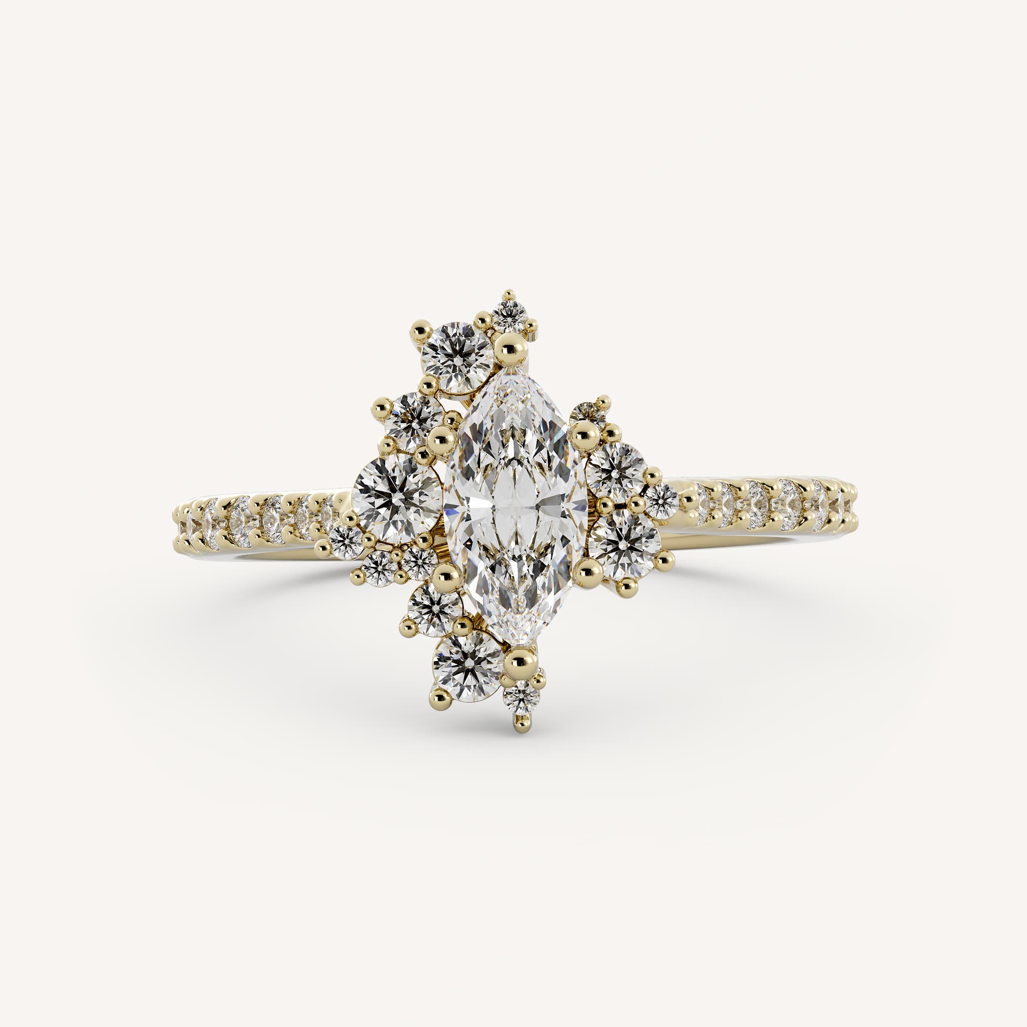 Avery features a marquise center stone with an asymmetrical burst halo set in a basket on a scallop prong diamond accented shank.