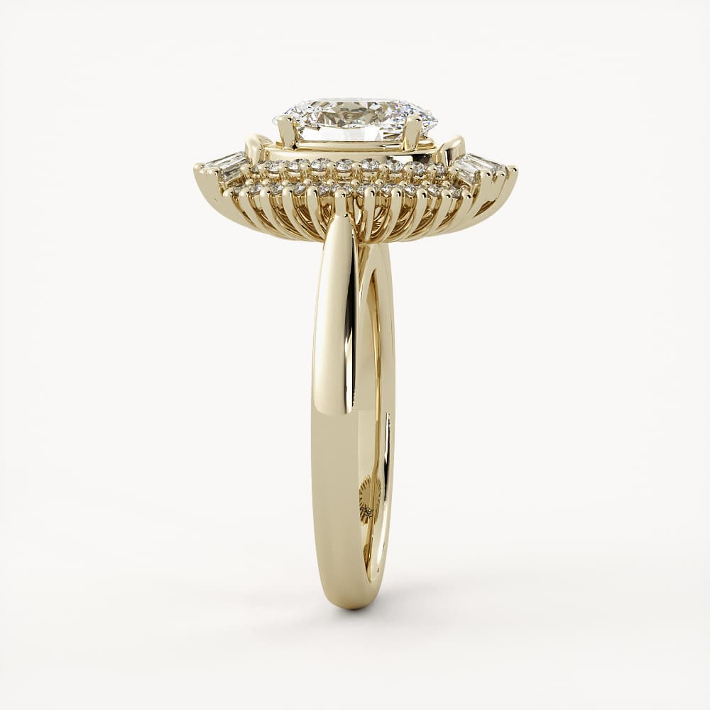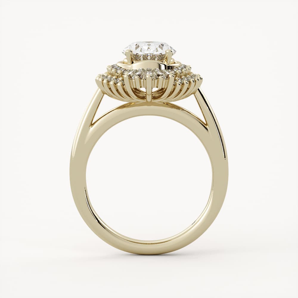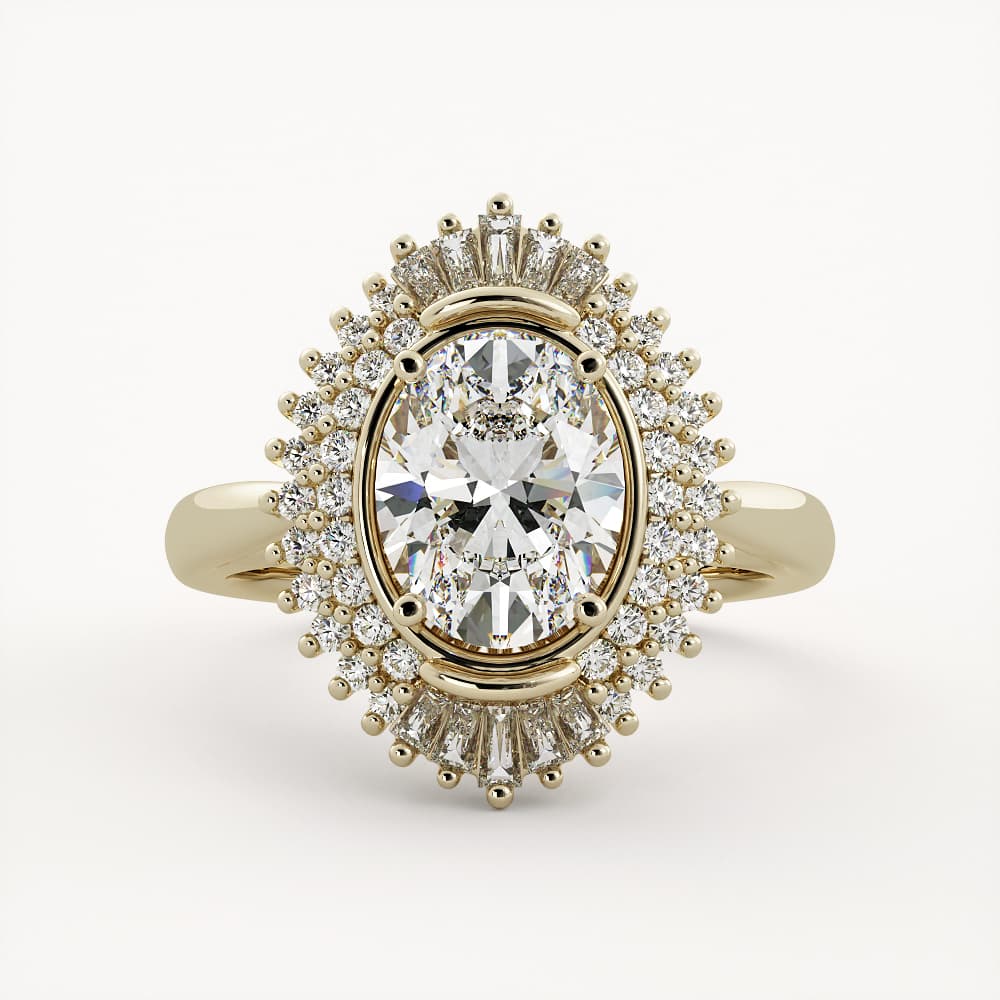 Carraway features an oval center stone with an intricate double burst halo made of round and baguette stones. Set in a cathedral basket on a half round shank.
