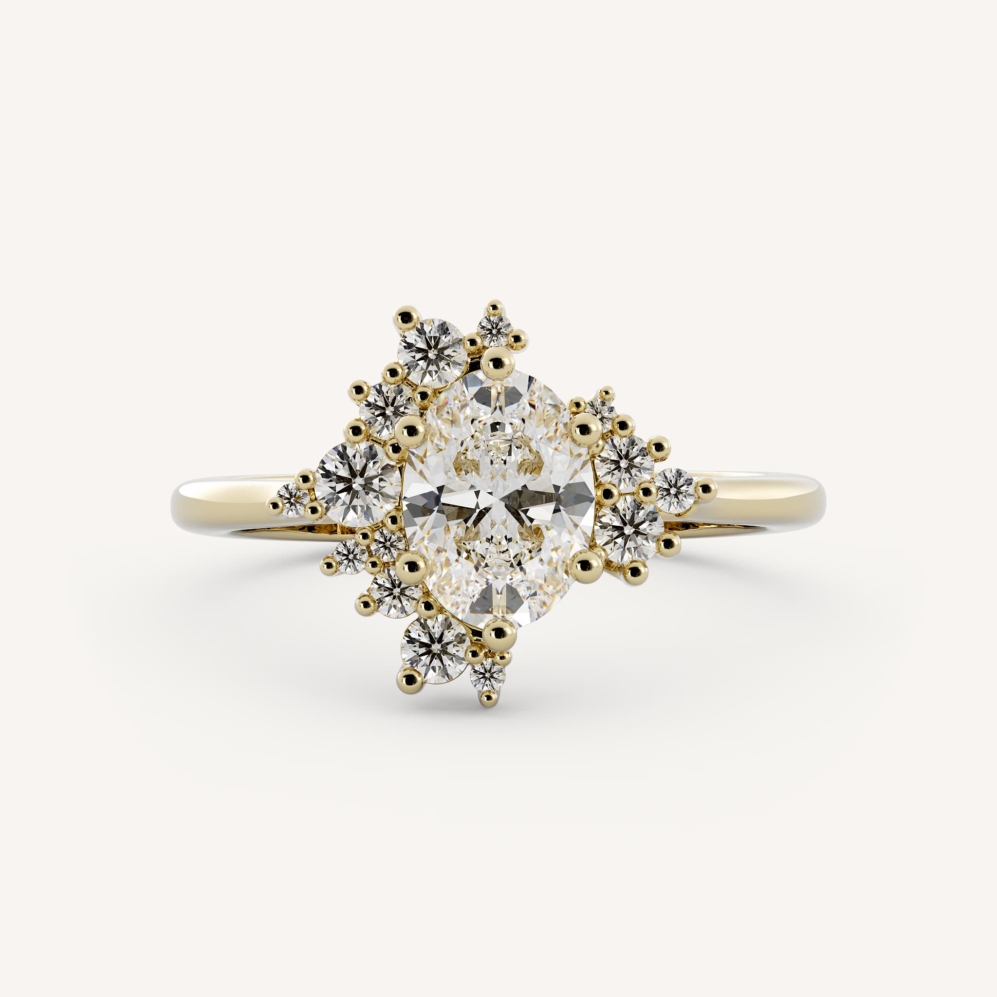 Collins features an oval center stone with an asymmetrical burst halo on a half round shank.
