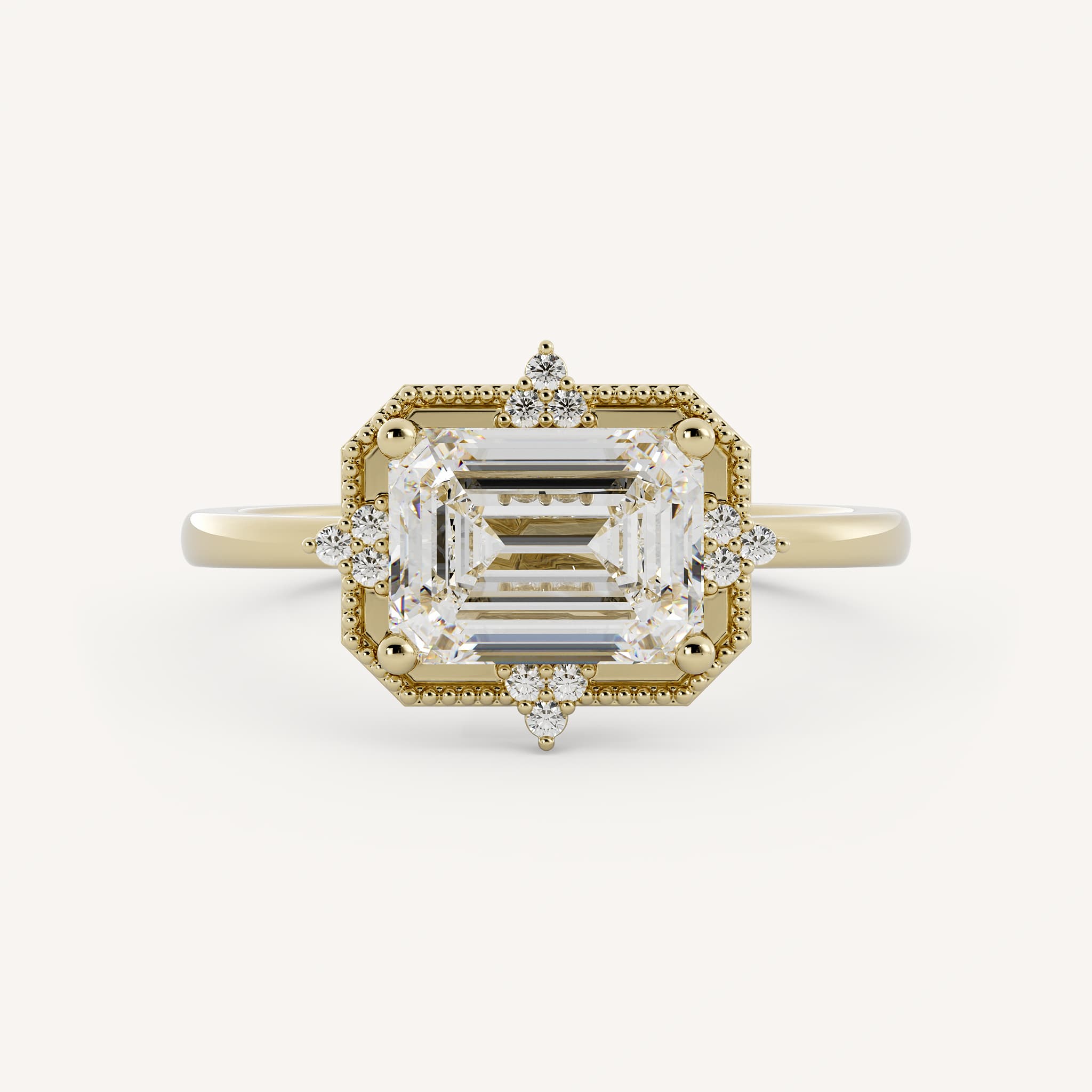 Erika features an east-west set emerald shaped center stone with clusters of round stones complete with a milgrain halo.