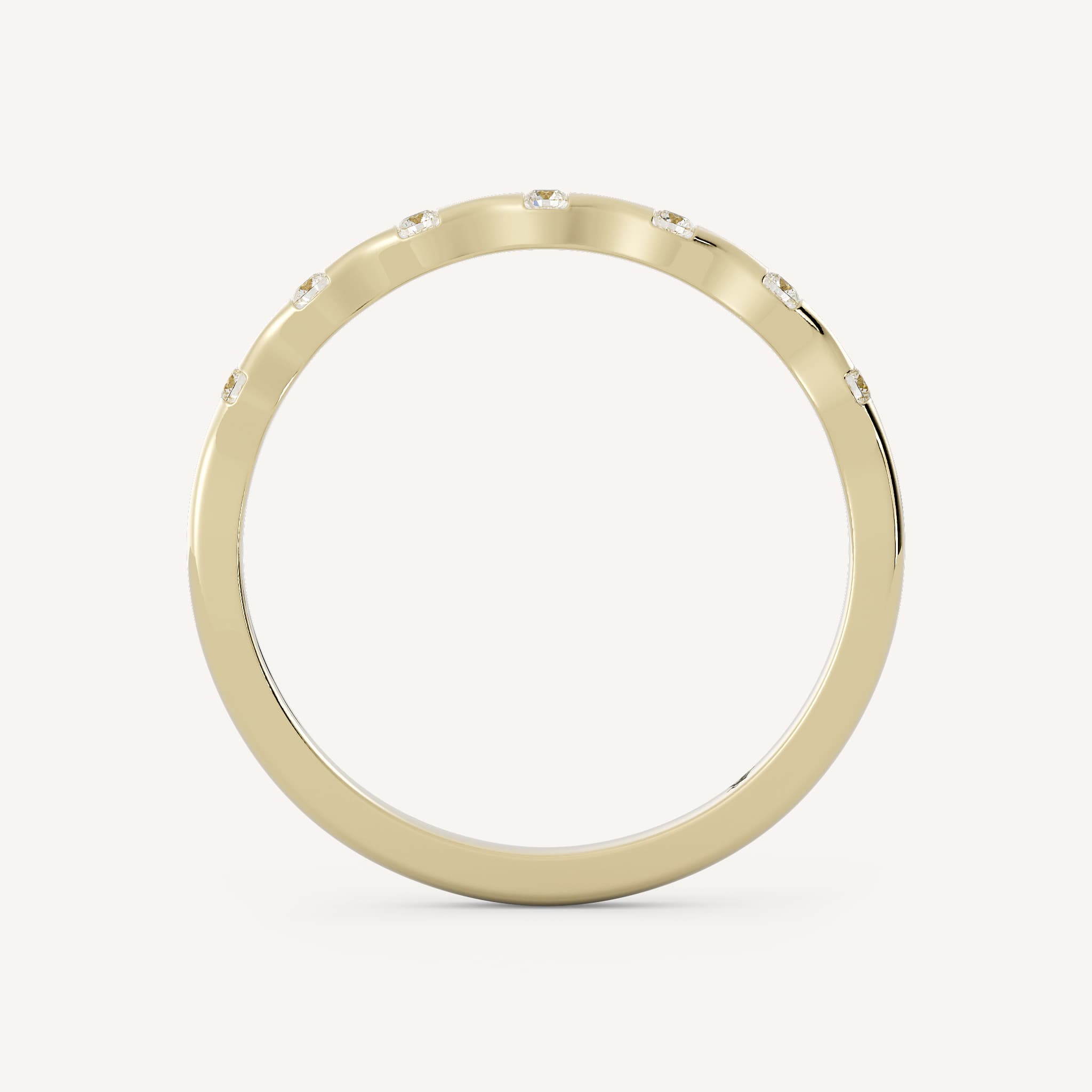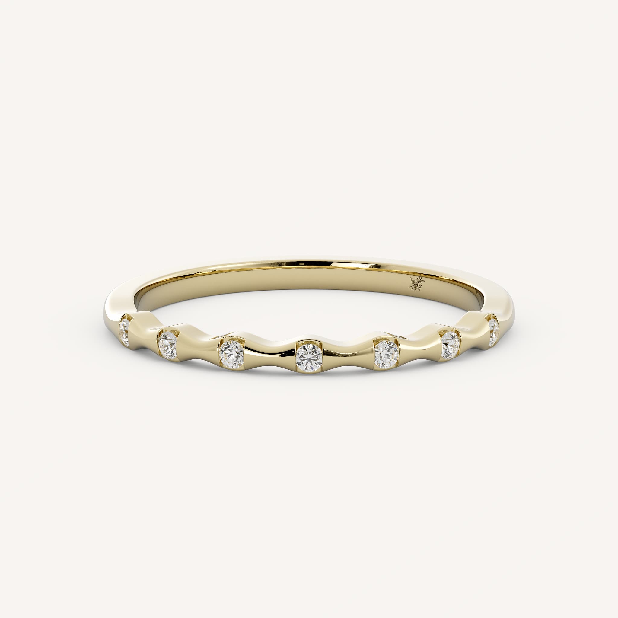 Jo is a band with evenly spaced small round diamonds set flush on a half round shank.