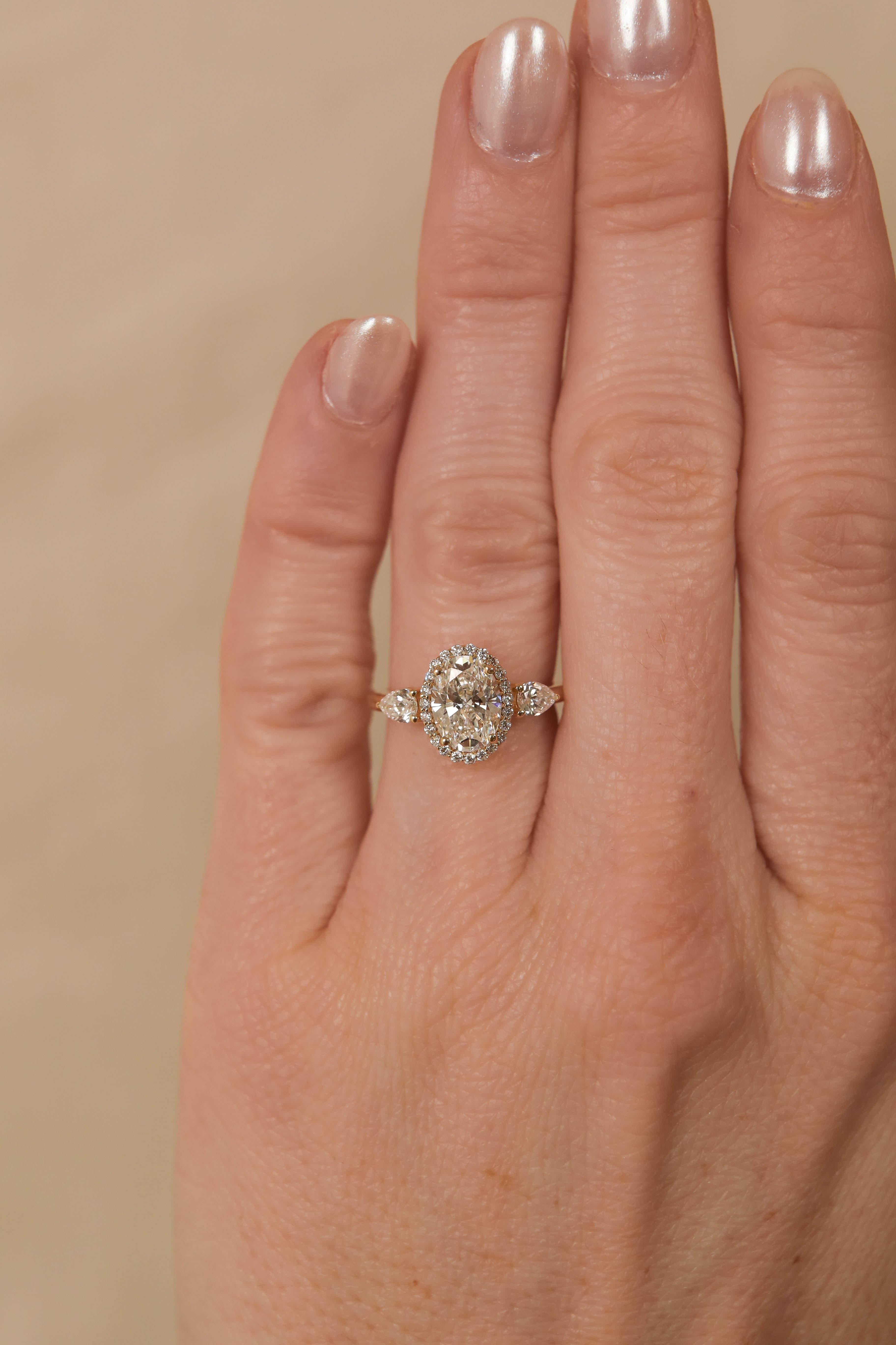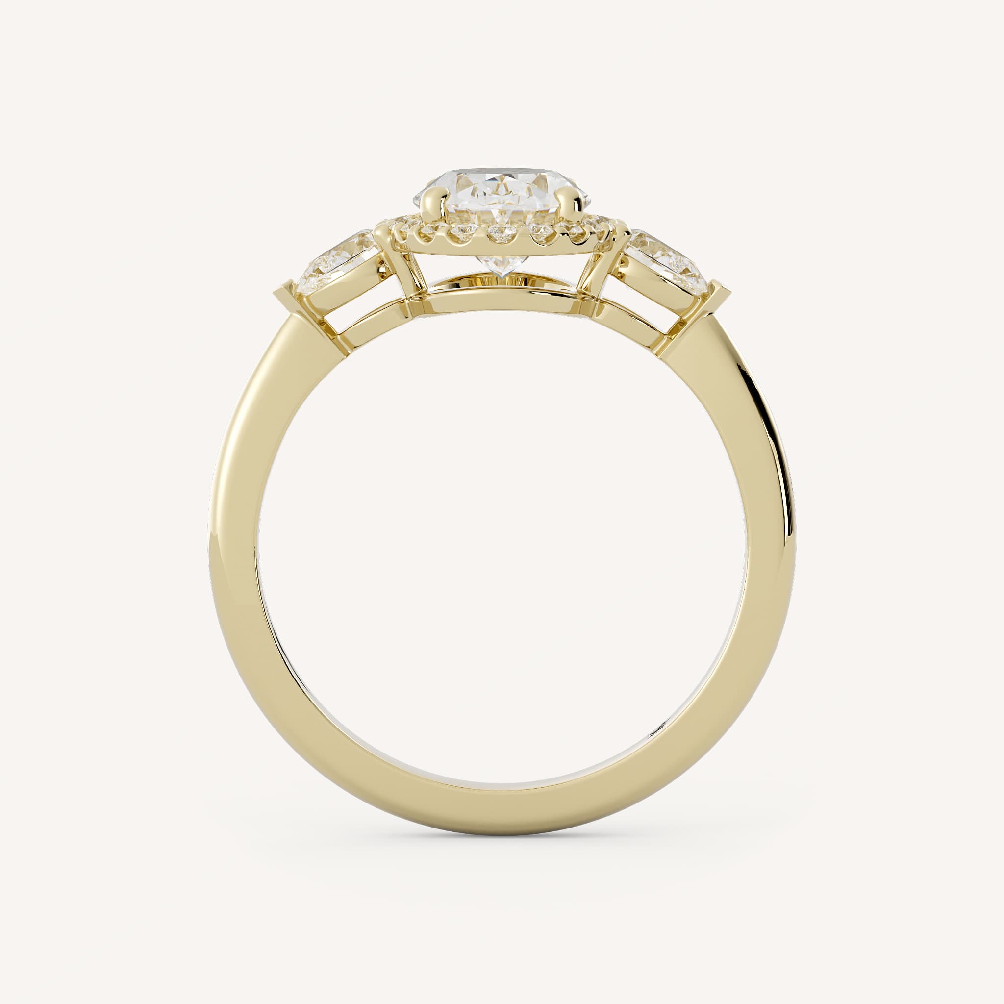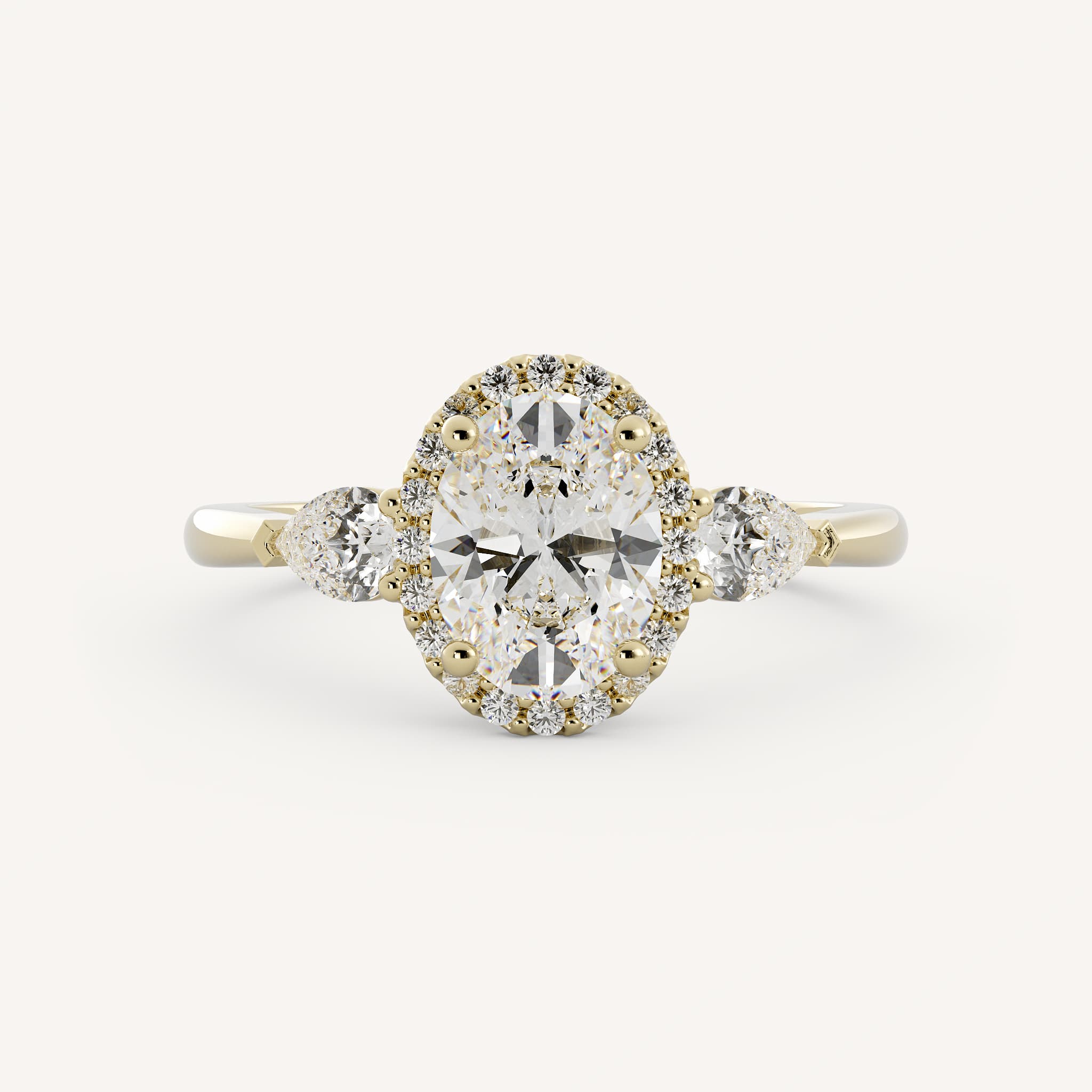 Roe features an oval center stone with a classic halo and pear accent stones set in a lovely three stone basket on a half round flat edge shank.